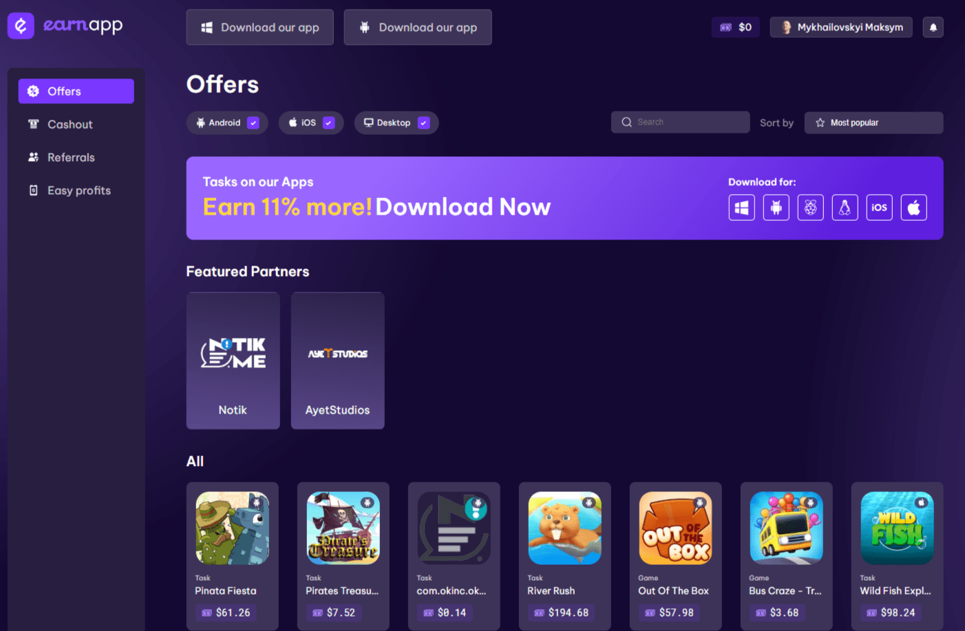 EarnApp — это простой способ получить пассивный доход, используя не незадействанную часть вашего интернет-трафика и мощности простаивающего CPU. Когда устройство подключено к сети, приложение в фоновом режиме передаёт часть пропускной способности для безопасных аналитических задач крупных компаний.