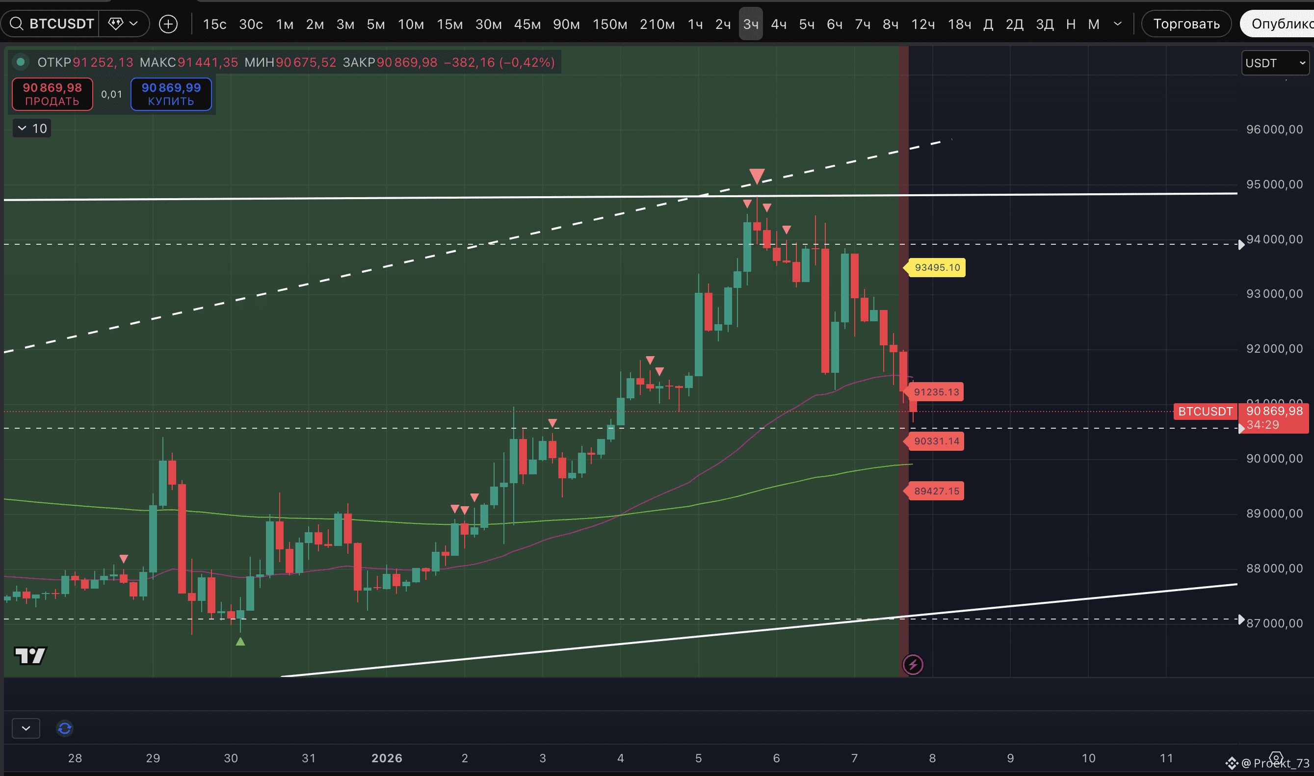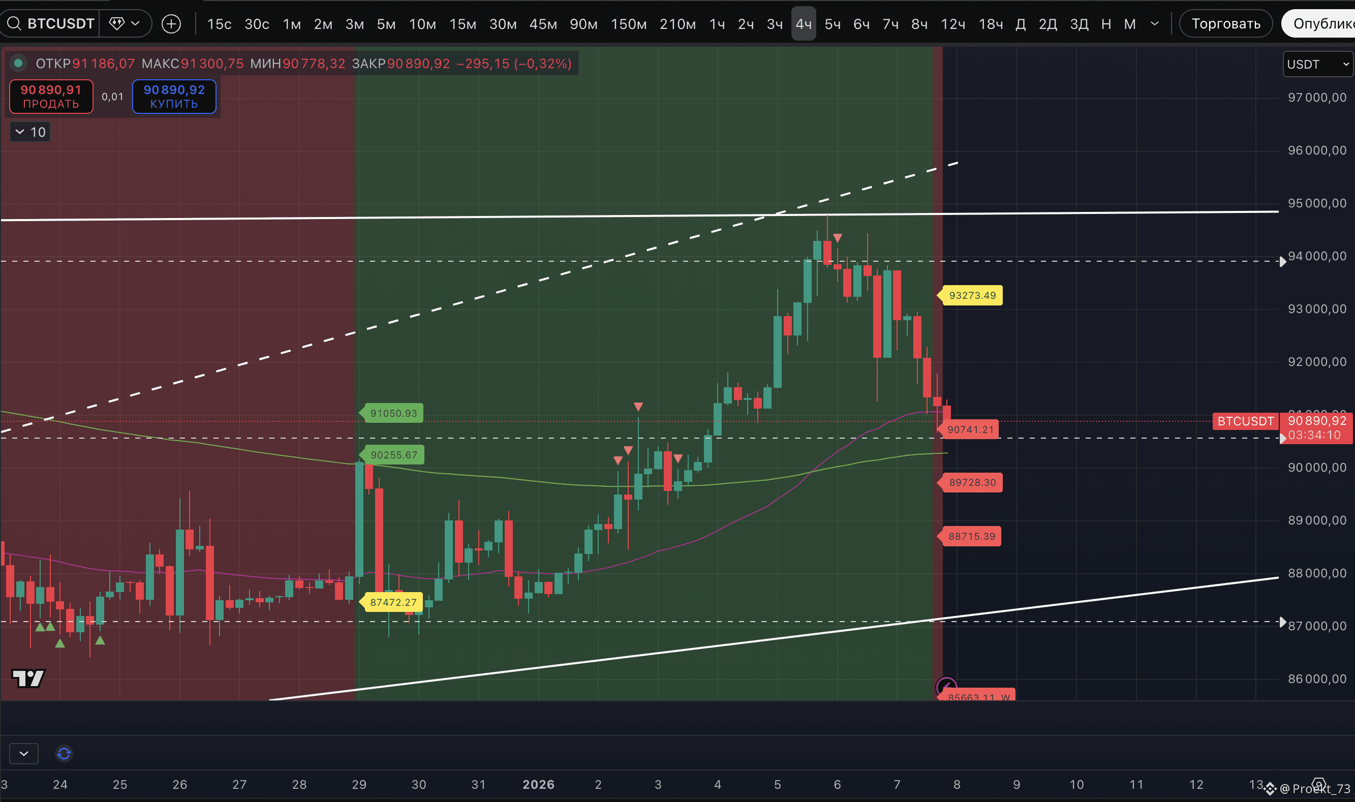 Базовые цели даунтренда #BTC на 4-часовом ТФ, которые еще не отработали: 89 728$ и 88 715$. Уровень потенциального слома - 93 273$.