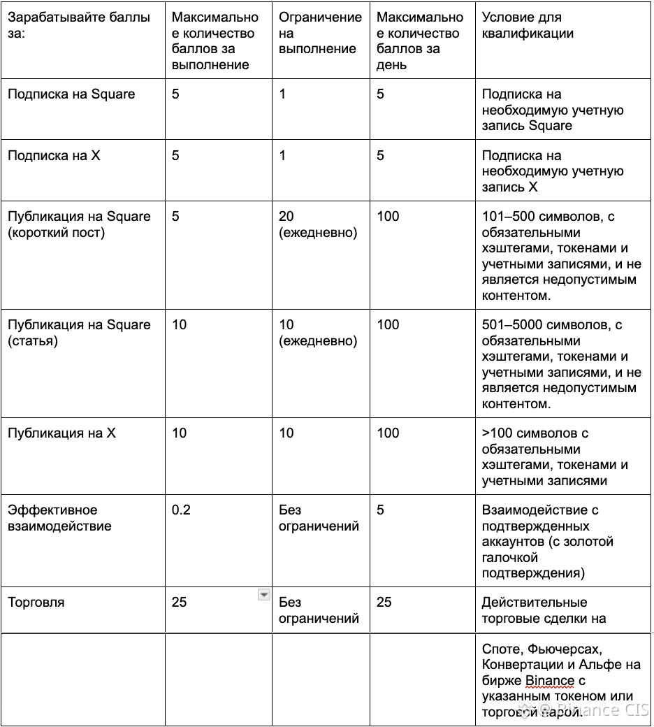 Square Points рассчитываются ежедневно на основе суммы баллов, полученных за ваш контент, активность и торговлю на бирже Binance (за исключением Web3-кошелька).