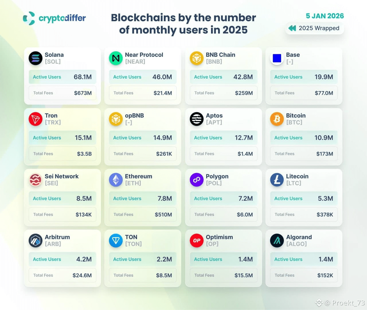 По данным #Cryptodiffer, лидер по ежемесячно активным пользователям (ежемесячно активные пользователи, MAU) - однозначно Solana (#SOL): 68,1 млн за год. Дальше идут Near Protocol (#NEAR) - 46,0 млн и BNB Chain (#BNB) -42,8 млн.