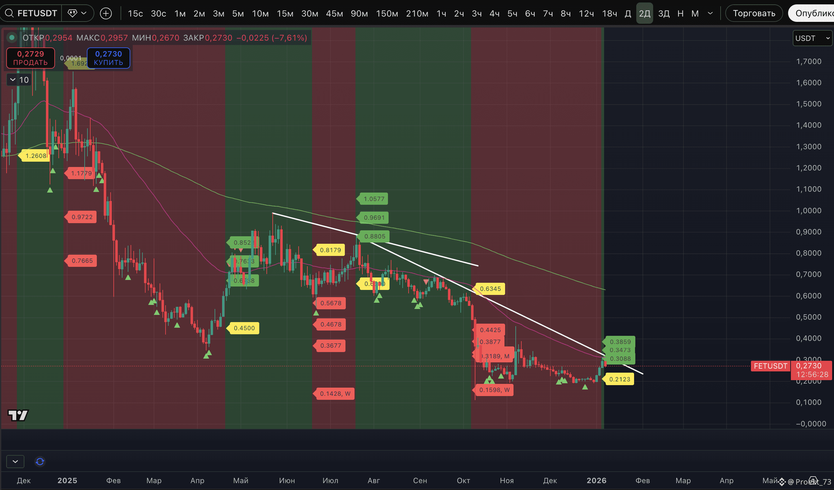 - #FET. Многострадальный боец ИИ-сектора, которому досталось от распада альянса трех проектов. С базовыми целями 0,3088$, 0,3473$, 0,3859$.