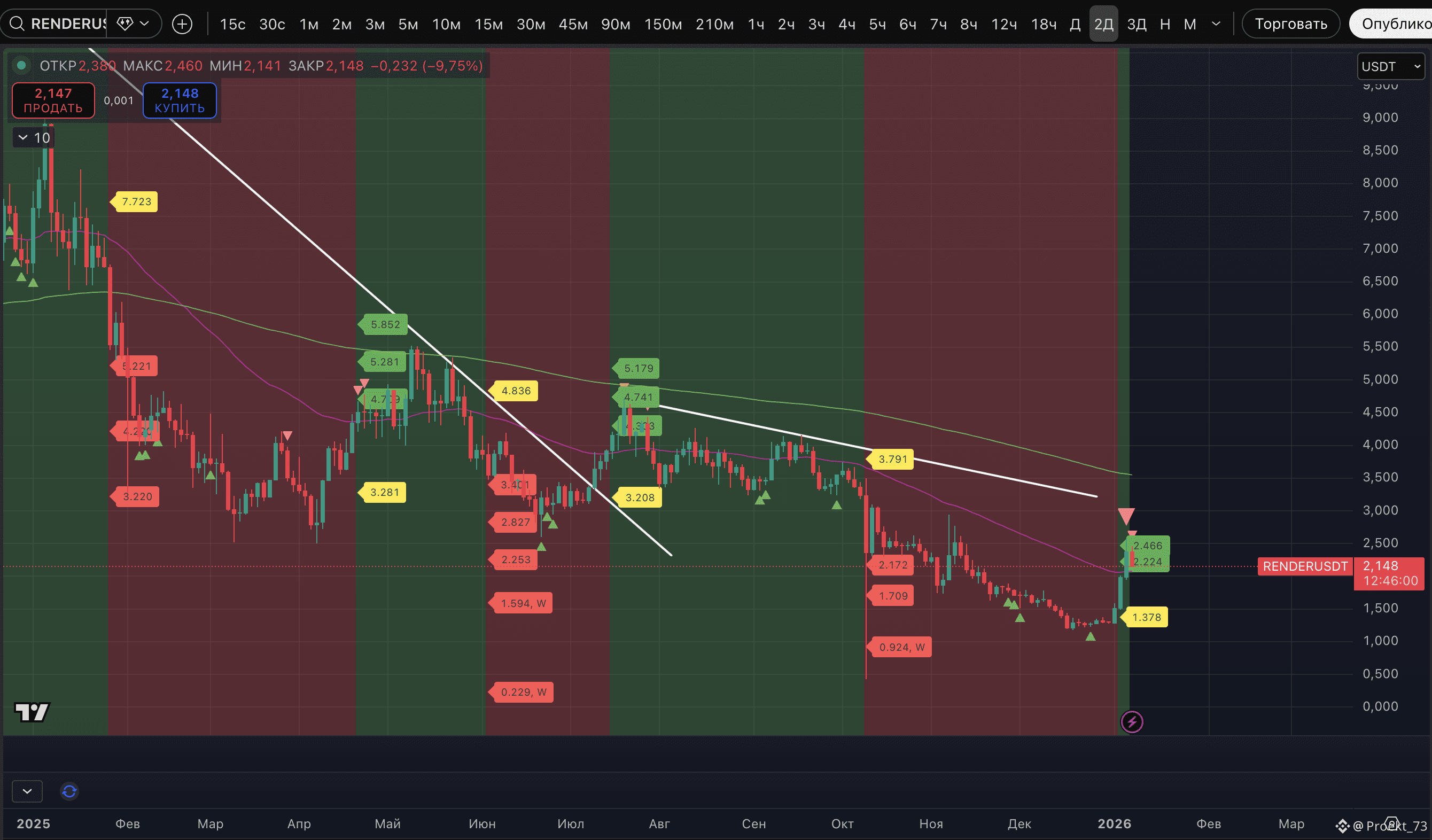 - #RENDER. Здесь базовые цели тоже уже отработаня. Более того - есть Strong signal потенциального хая на 2-дневном ТФ, что для быков скверно. Эта метка уже отрабатывает.