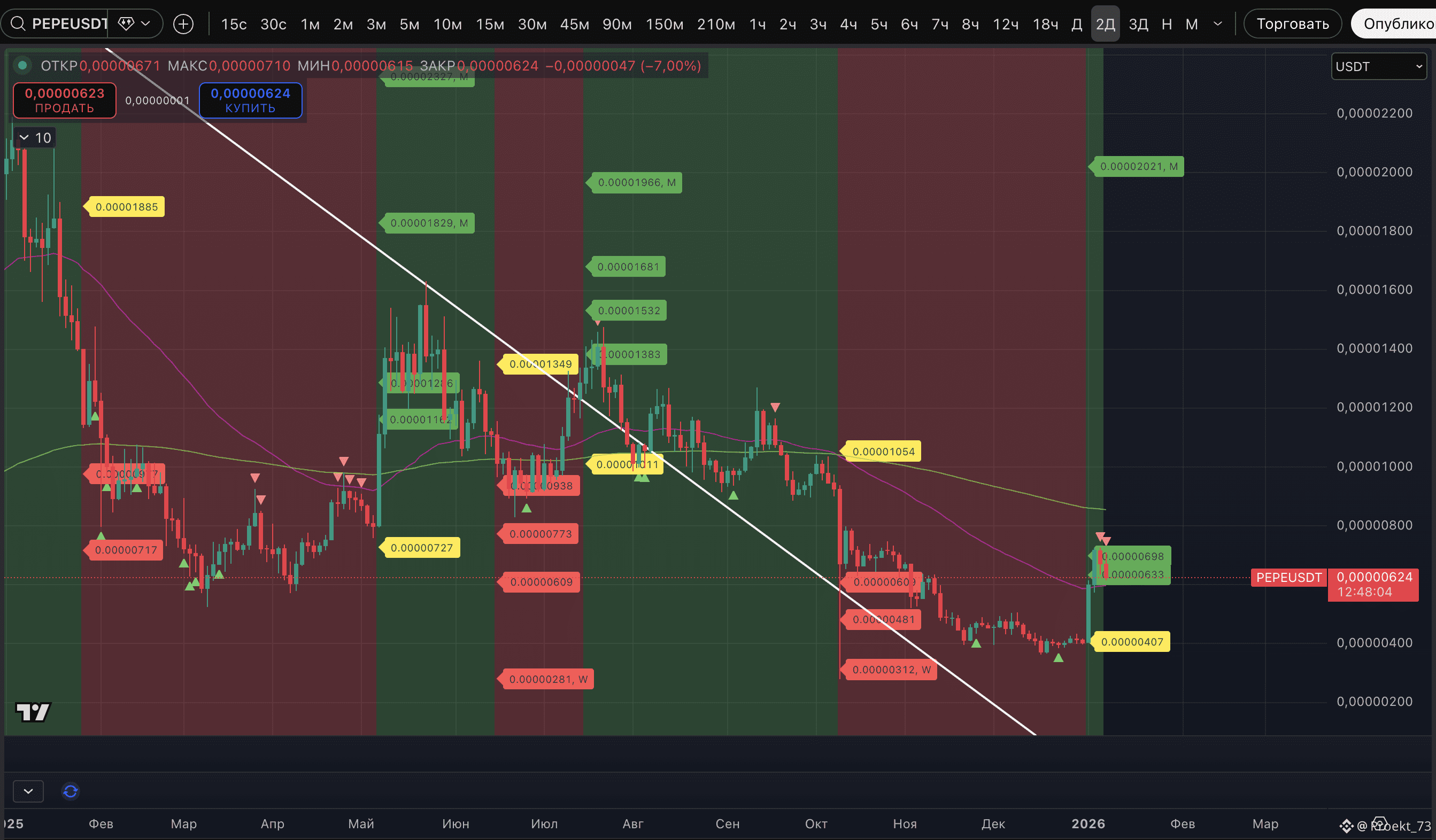 - #PEPE. Это сейчас один из флагманов роста сектора мемкоинов, о которых писали в отдельном посте. И который пока споткнулся о коррекцию рынка. Но - не отменился, не получил слома. По этому активу базовые цели уже отработаны и сейчас от меток хая развивается коррекция.