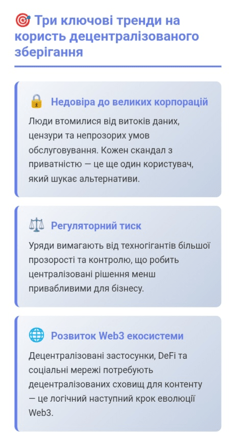 Давайте посмотрим на цифры. Глобальный рынок облачных хранилищ сейчас оценивается примерно в 200 миллиардов долларов и продолжает расти на 20-25% ежегодно. Каждый год мы генерируем всё больше данных: рабочие документы, фотографии, видео, резервные копии, медиаконтент. И вся эта информация хранится преимущественно в централизованных дата-центрах Amazon, Google, Microsoft. Но вот вопрос, над которым я задумалась: будет ли это всегда так? Не пришло ли время изменить парадигму?