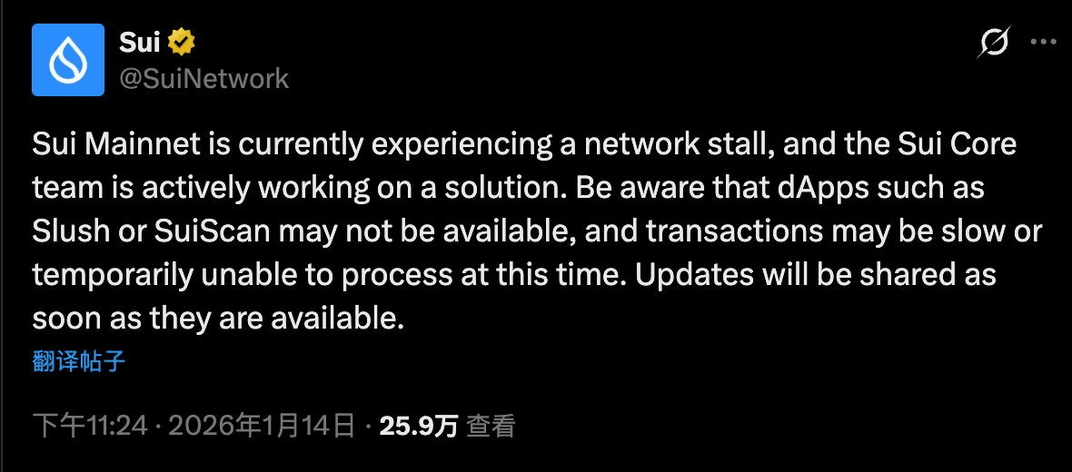По пекинскому времени 14 января около 23:30, @SuiNetwork основная сеть внезапно остановила создание блоков, все DApp и транзакции на время замерли.