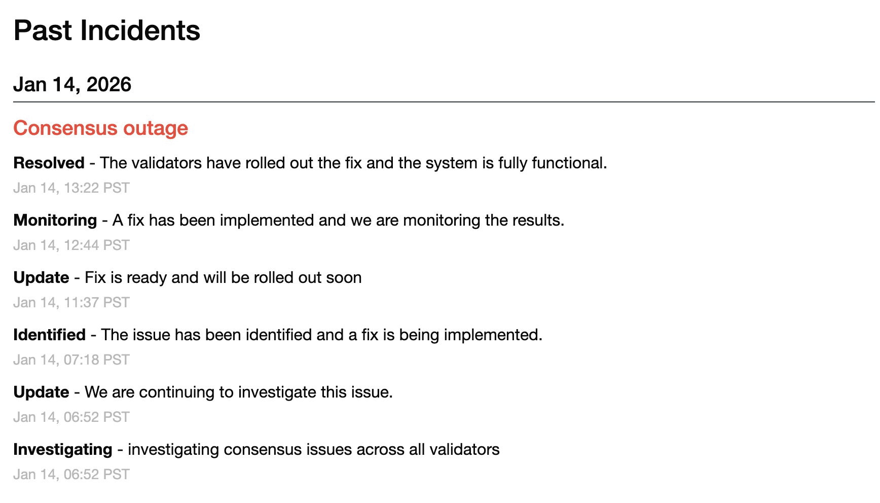14 января 22:52 (UTC+8): официально подтверждено, что у всех валидаторов возникли проблемы с консенсусом, начато расследование.