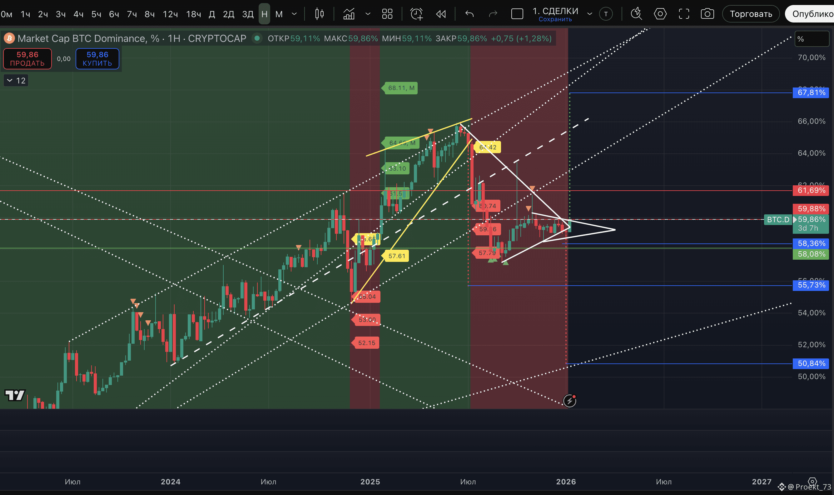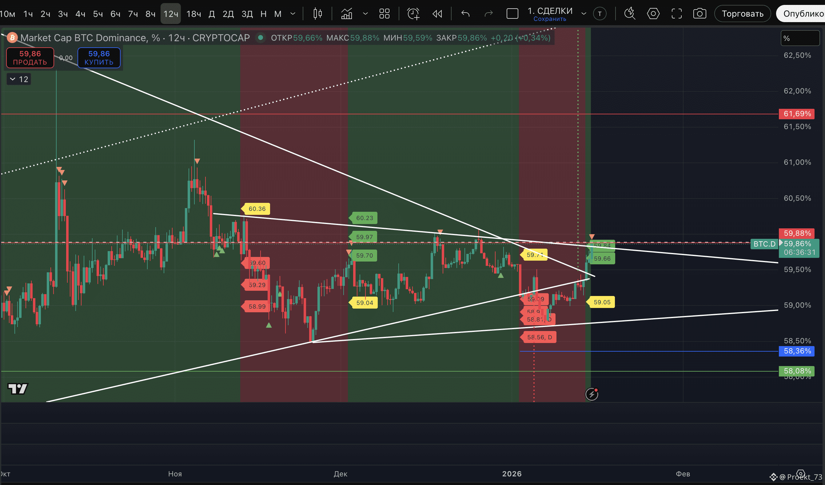 Во-первых, доминация пришла к уровню 59,88%. В случае пробоя и закрепления выше - это негатив.