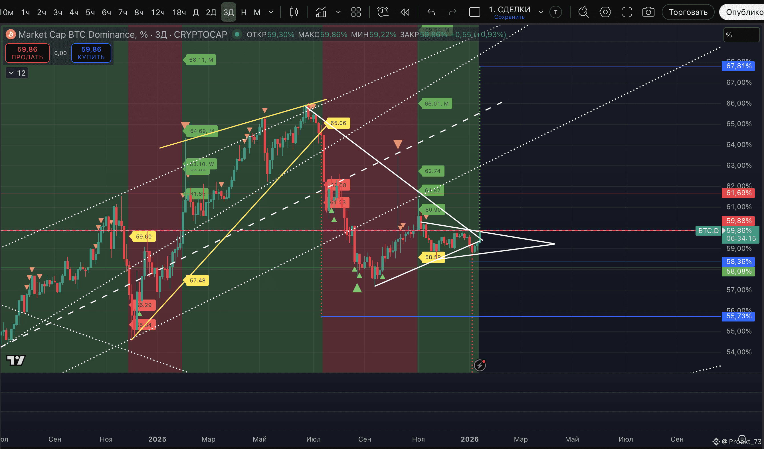 - Не возвращаться выше горизонтального уровня 59,88%. Рост доминации биткоина уже давно не ассоциируется ни с чем хорошим для альткоинов, поэтому оптимистичный сценарий "доминация BTC растет, но альткоины тоже показывают рост" - не рассматриваем. Пока рынок не убедит на практике, что это снова возможно.