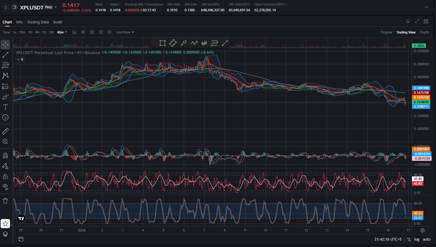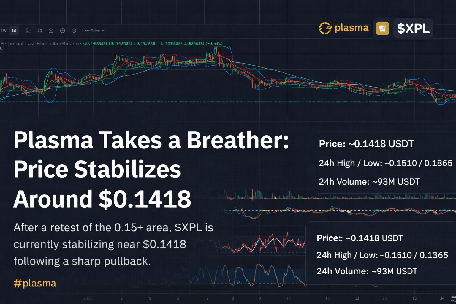 Плазма движется через фазу, которая показывает свою ценность только если вы действительно смотрите на ленту, а не только на заголовки. На 45-минутном графике, $XPL текущая цена колеблется около 0.141–0.142 USDT, после резкого отката от региона 0.15+. Цена находится ниже краткосрочных скользящих средних, волатильность сжата, а индикаторы импульса нейтральны или слегка перепроданы. Это не эйфория, это переваривание. За последние 24 часа объем XPLUSDT Perp составляет примерно 648M XPL, что эквивалентно около 93M USDT, с открытым интересом около 52M USDT. Это рассказывает ясную историю: участие не исчезло, кредитное плечо все еще присутствует, но направление определяется медленно.