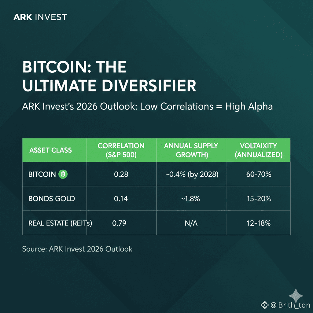 Cathie Wood just released ARK’s 2026 outlook, and the data is undeniable: Bitcoin is the ultimate diversifier. While traditional hedges like gold and bonds are becoming more tied to the general market, Bitcoin remains fiercely independent. With a correlation to the S&P 500 of just 0.28—compared to nearly 0.80 for Real Estate—it is the only asset class providing true protection against systemic risk.