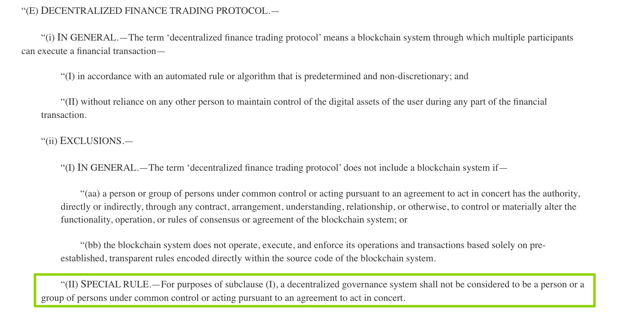Суть в том, что определение «децентрализации» в законопроекте чрезвычайно строгое. Любая система с комитетом управления или мультиподписью не считается децентрализованной и требует соблюдения процедуры «Знай своего клиента» (KYC) и сообщения о подозрительной деятельности.