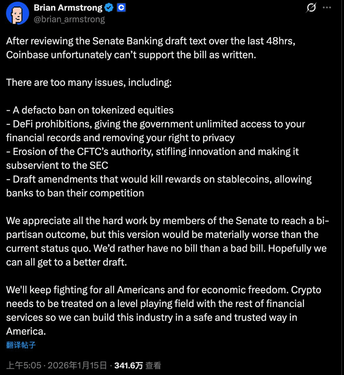 @coinbase CEO @brian_armstrong 深夜“撤回”对(2025 数字资产明确法案)(CLARITY Act) 的支持。