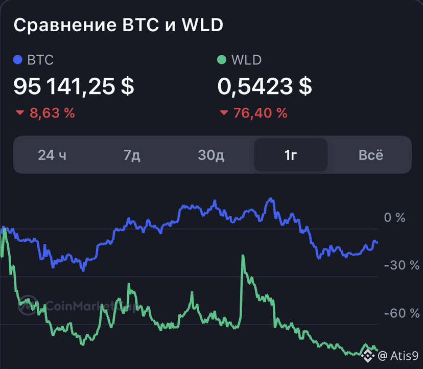 То есть при относительно умеренной коррекции BTC на ~17 % WLD потерял свыше половины стоимости за тот же временной интервал.