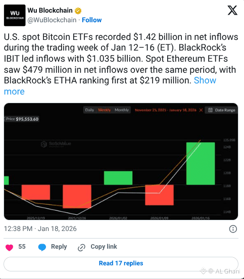 Between January 12 and January 16, U.S. spot Bitcoin ETFs recorded inflows of $1.42 billion and $1.035 billion, respectively, with BlackRock’s IBIT leading the charge.