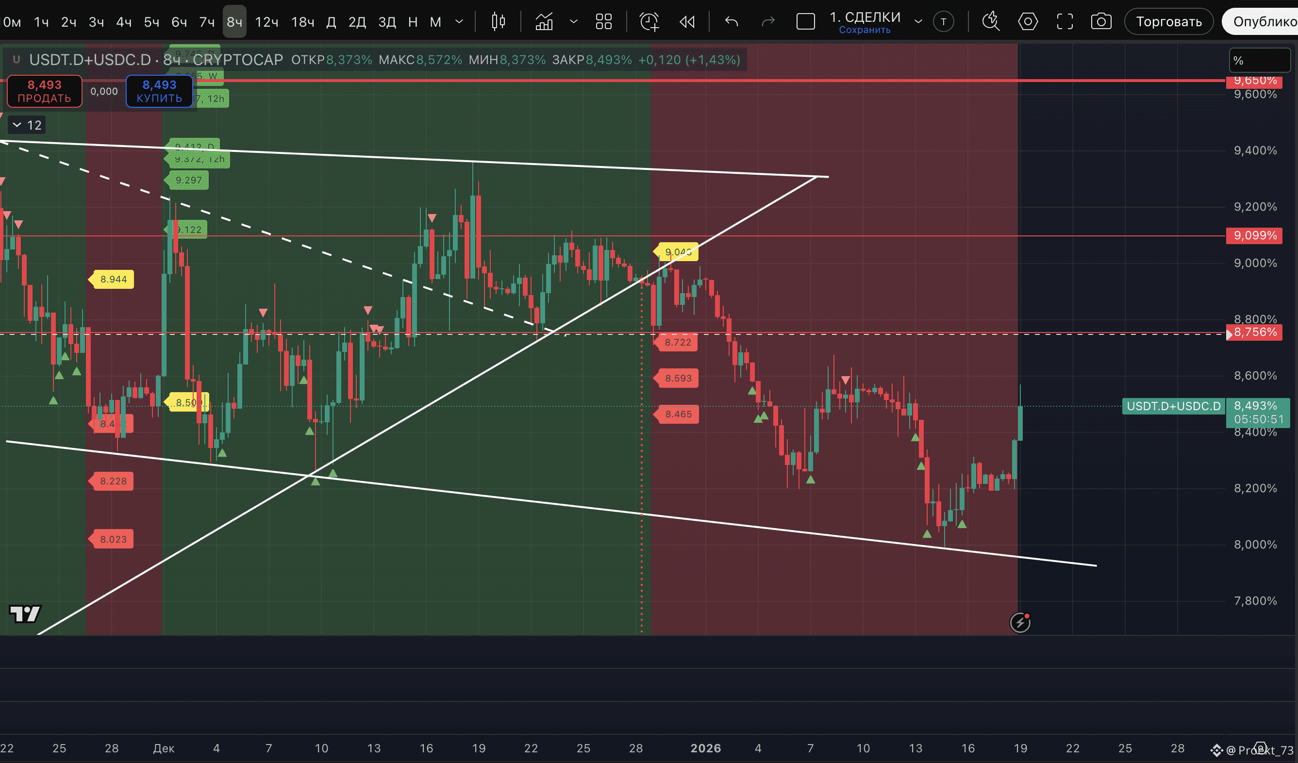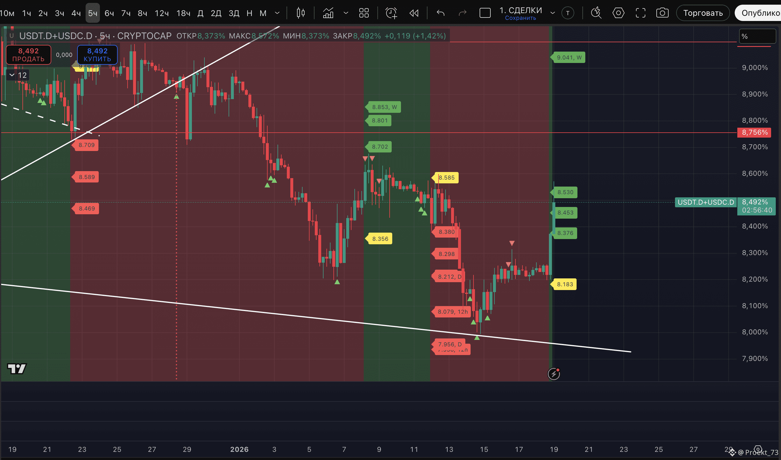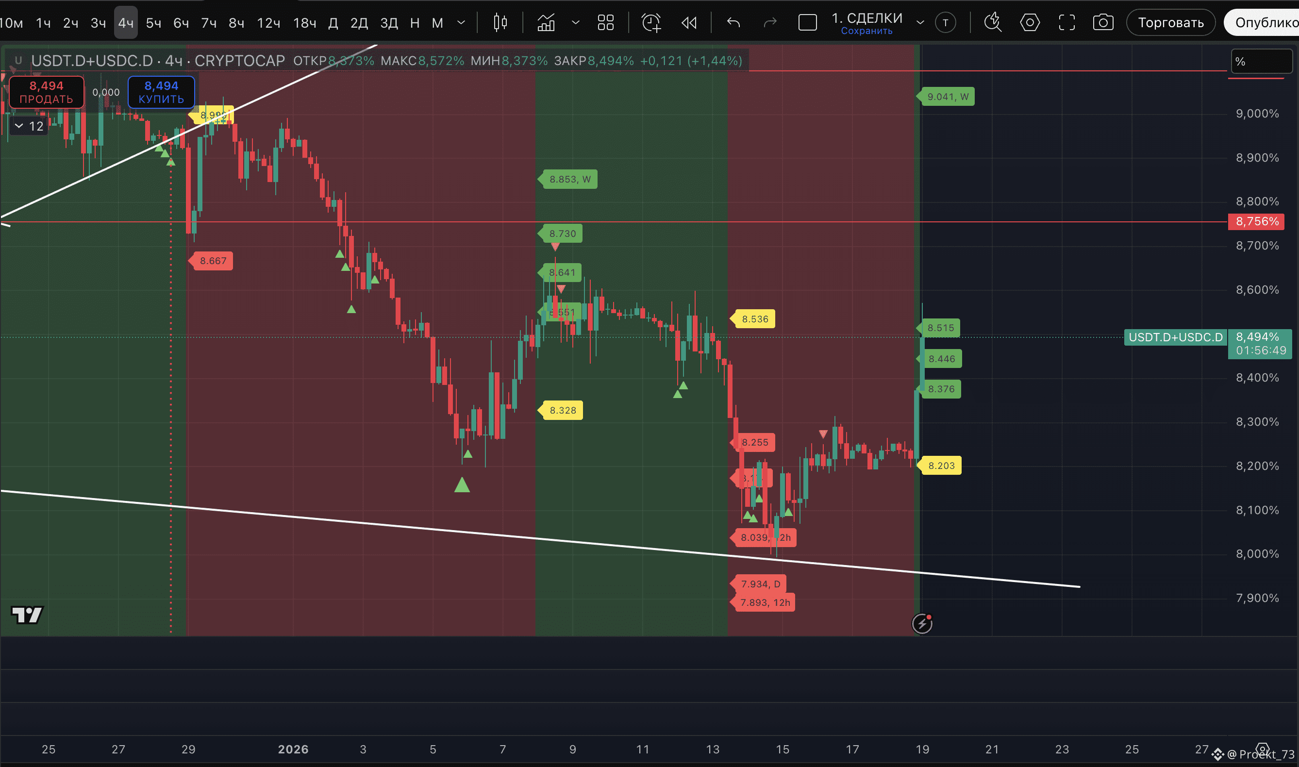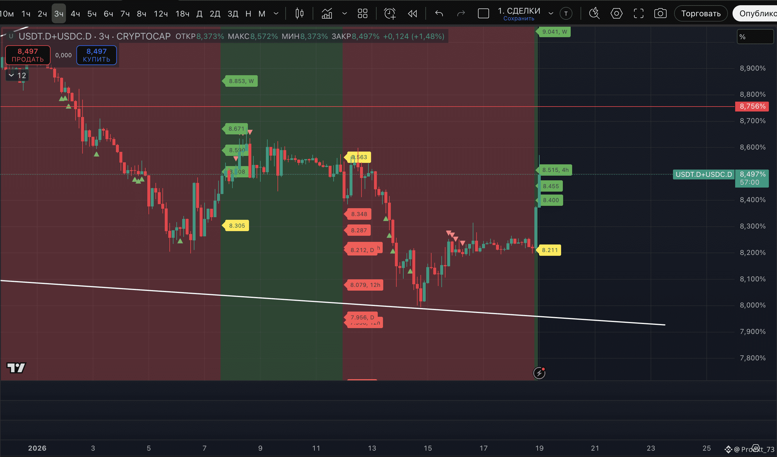 - На сейчас у доминации стейблкоинов - уже вторая метка потенциального хая на 12-часовом ТФ и даунтренд на этом ТФ - сохранен.