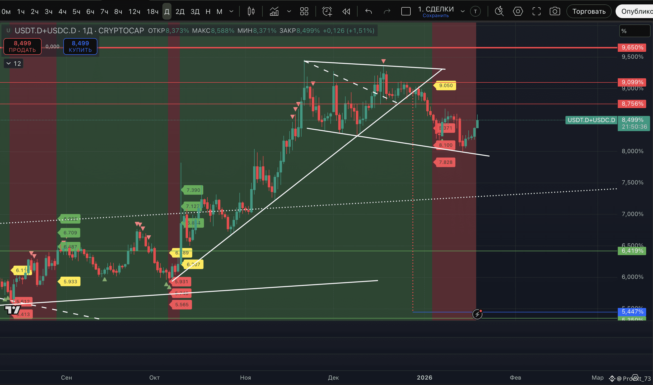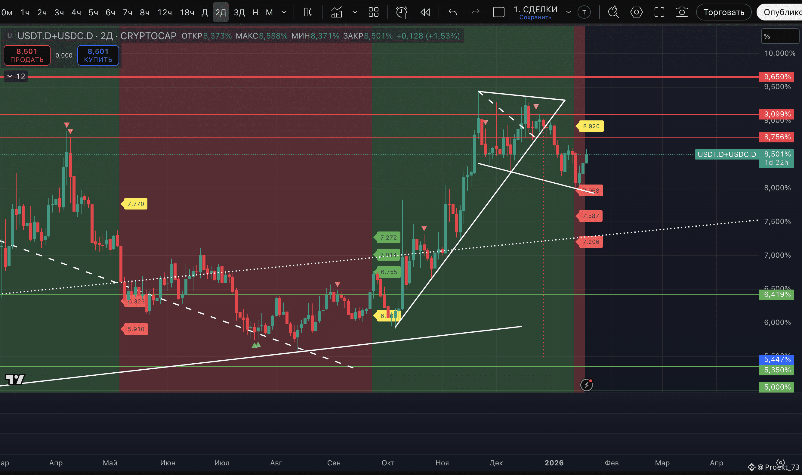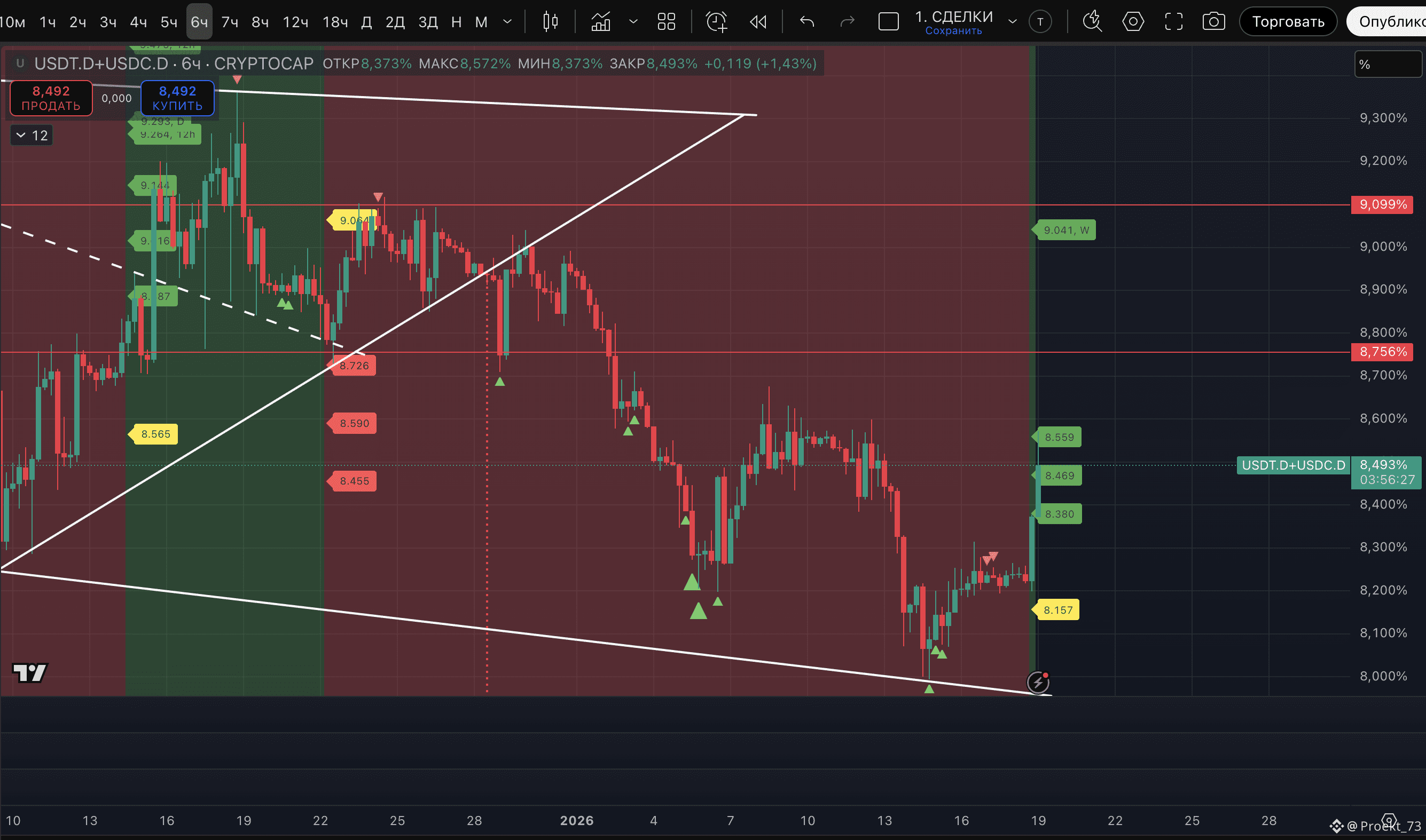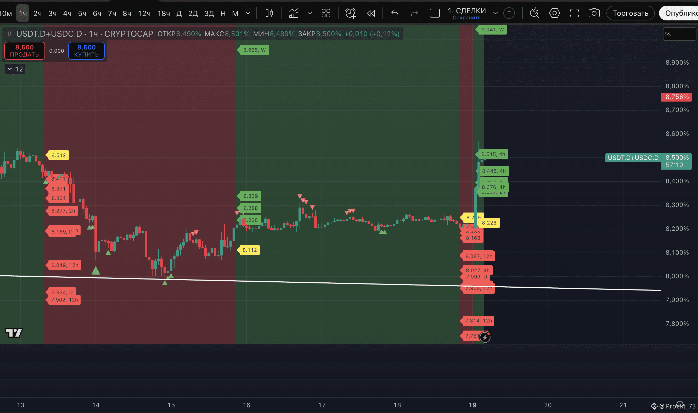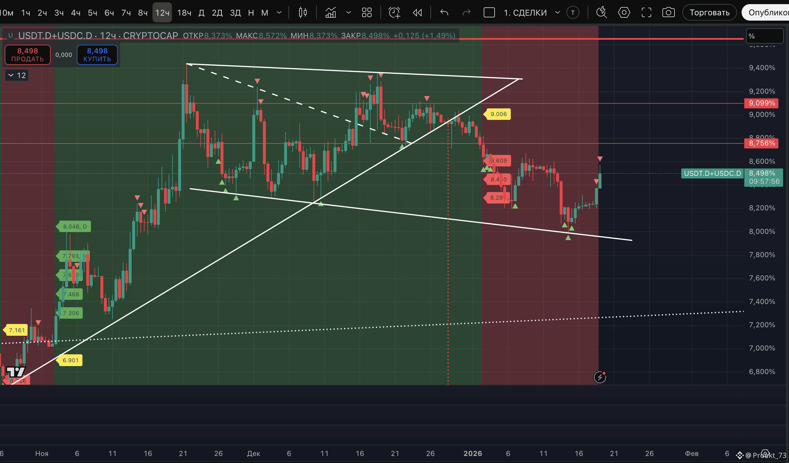 - На сейчас у доминации стейблкоинов - уже вторая метка потенциального хая на 12-часовом ТФ и даунтренд на этом ТФ - сохранен.