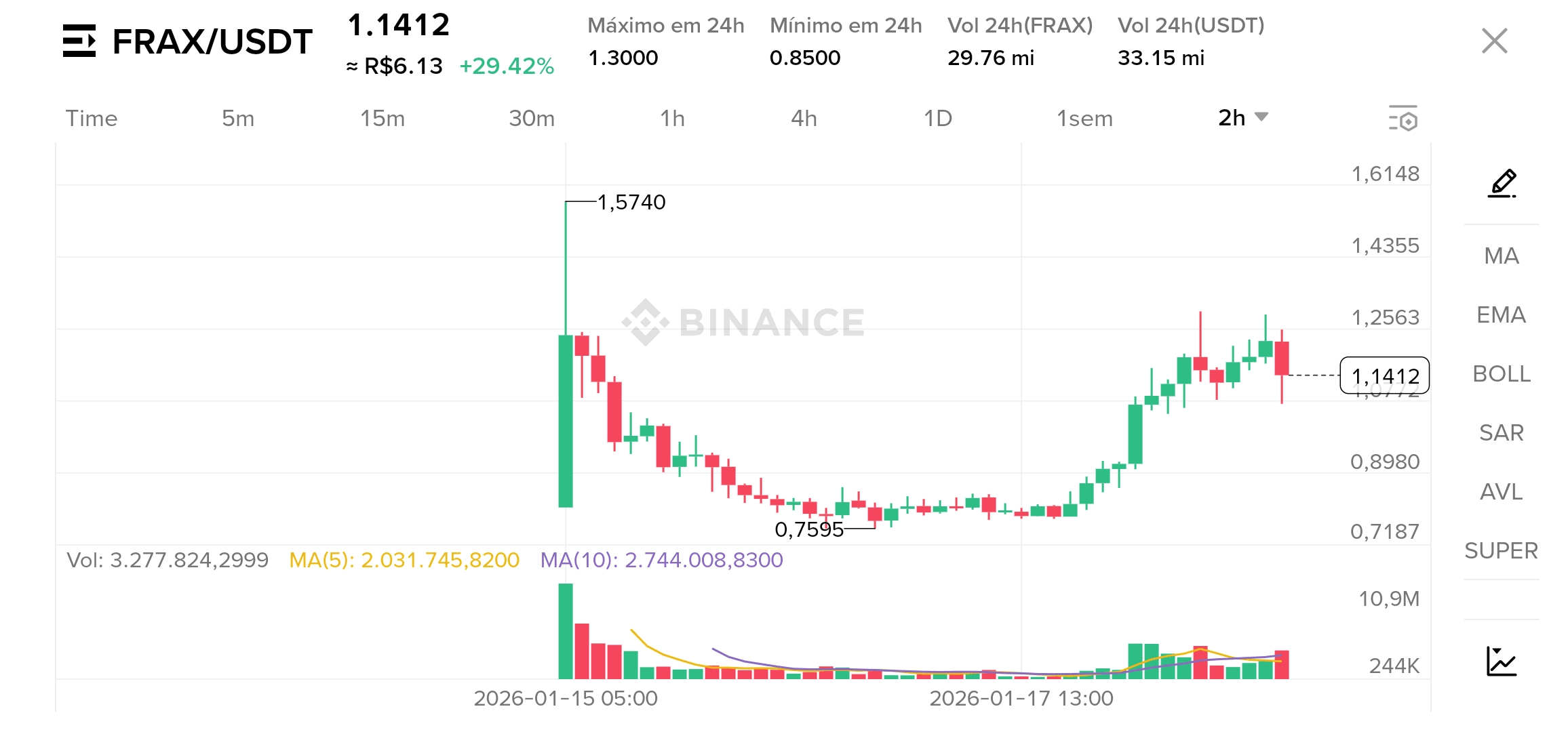 - Изменение за 24ч: +29.42% | Максимум дня: R$ 6.99