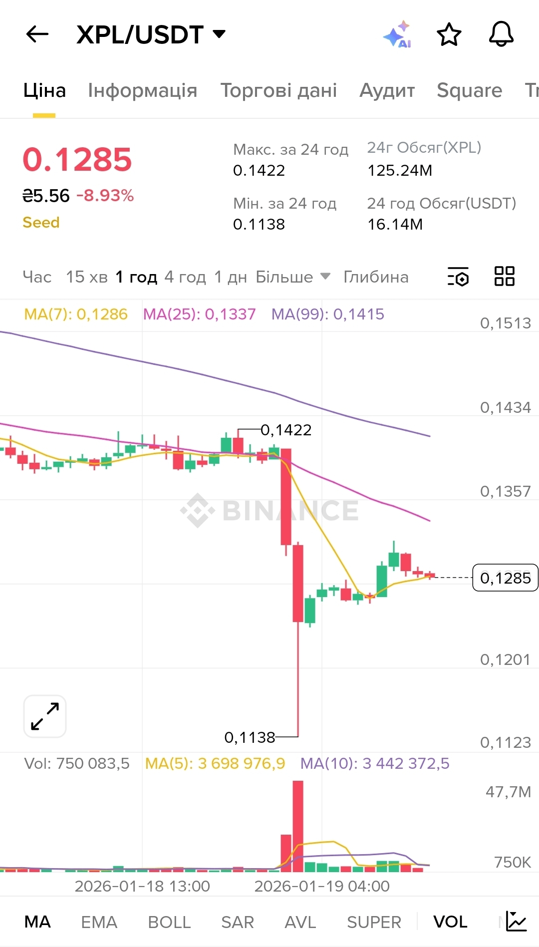 Сейчас $XPL торгуется на уровне 0.1285 USDT, что на 8.93% ниже по сравнению с предыдущим показателем. График показывает довольно драматичную картину – за последнюю сутки цена колебалась от минимума 0.1138 до максимума 0.1422, и это говорит о серьезной волатильности. Объем торгов впечатляет – 125.24 миллиона XPL за 24 часа, что свидетельствует о активном интересе трейдеров. Особенно интересным выглядит тот массивный красный свечник на графике около 19 января, когда произошел резкий обвал с последующим восстановлением. Скользящие средние MA(7) на уровне 0.1286, MA(25) на 0.1337 и MA(99) на 0.1415 показывают, что текущая цена находится ниже всех основных трендовых линий, что технически может означать либо перепроданность, либо продолжение нисходящего тренда.