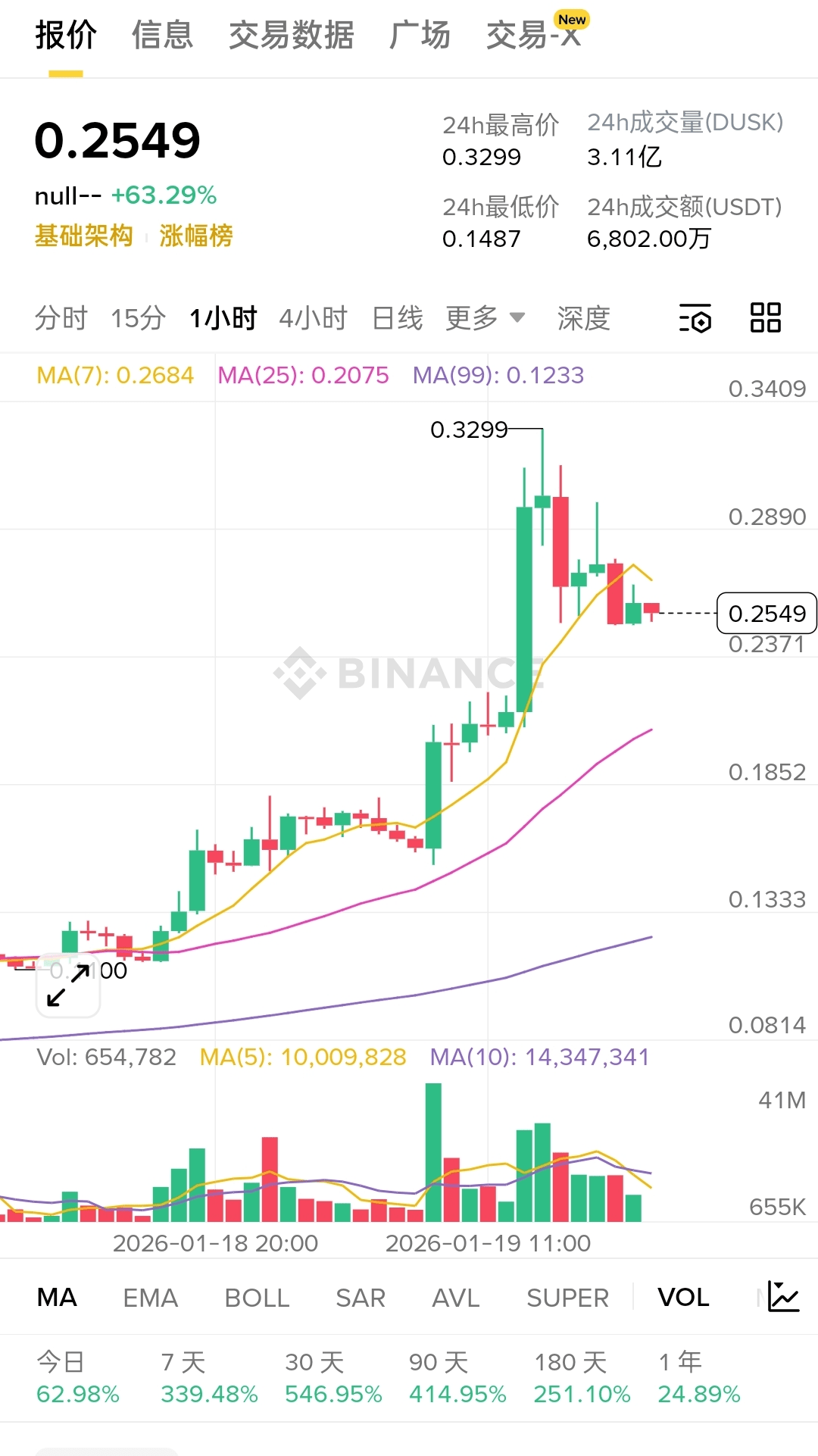 Недавно $DUSK (Dusk Network) наблюдается значительный рост, текущая цена около $0.25‑0.26 долларов, за последние 7 дней рост составил более 300%, объем и активность на рынке значительно увеличились, что свидетельствует о повышенном интересе со стороны инвесторов.