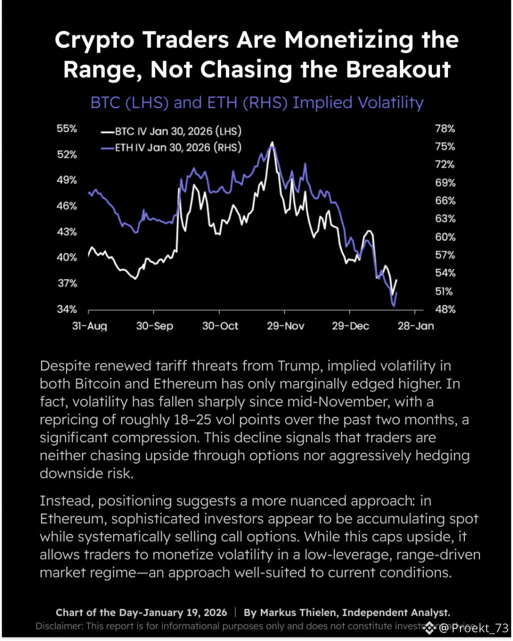 Несмотря на возобновившиеся угрозы пошлин со стороны Трампа, подразумеваемая волатильность как у #BTC, так и у #ETH выросла незначительно. Более того, волатильность резко снизилась, и за последние два месяца произошла переоценка примерно на 18-25 пунктов волатильности, то есть существенное сжатие.