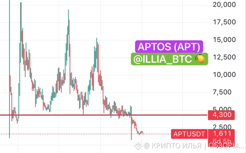 🌑Цену Aptos с января 2023 года (начало бычьего рынка) до октября 2025 года - удерживала поддержка: ~4,3$. После пробоя этой поддержки коррекция усложнилась, и на откате цены вернуть уровень покупателям не удалось…