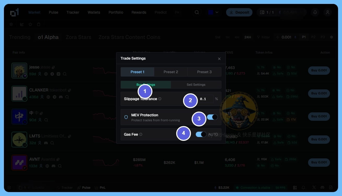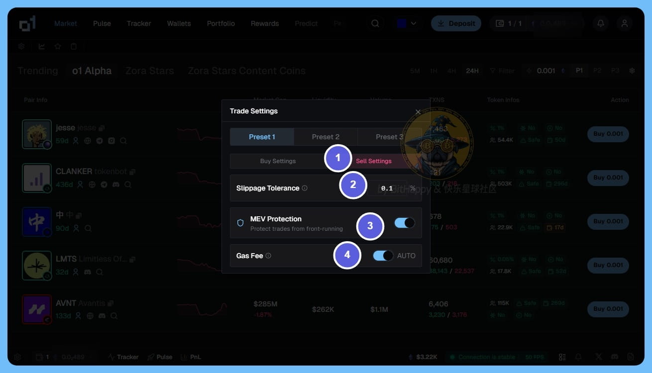 Установите проскальзывание при покупке: нажмите кнопку настроек → введите Slippage Tolerance как 0.1 → MEV Protection оставьте включенным → Gas Fee оставьте включенным