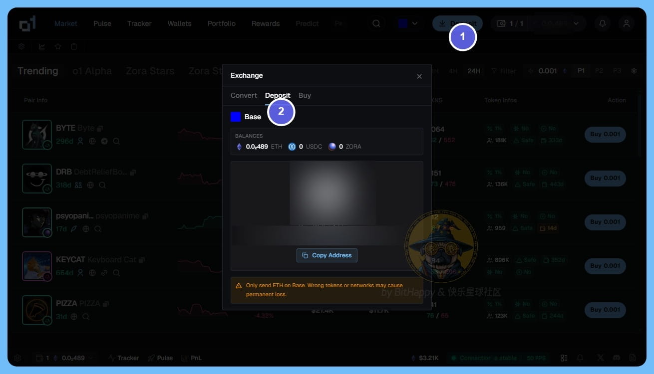 Поскольку в настоящее время торговые баллы USDC еще не отображаются, выберите внесение ETH через сеть Base, а затем выполните последующие действия.