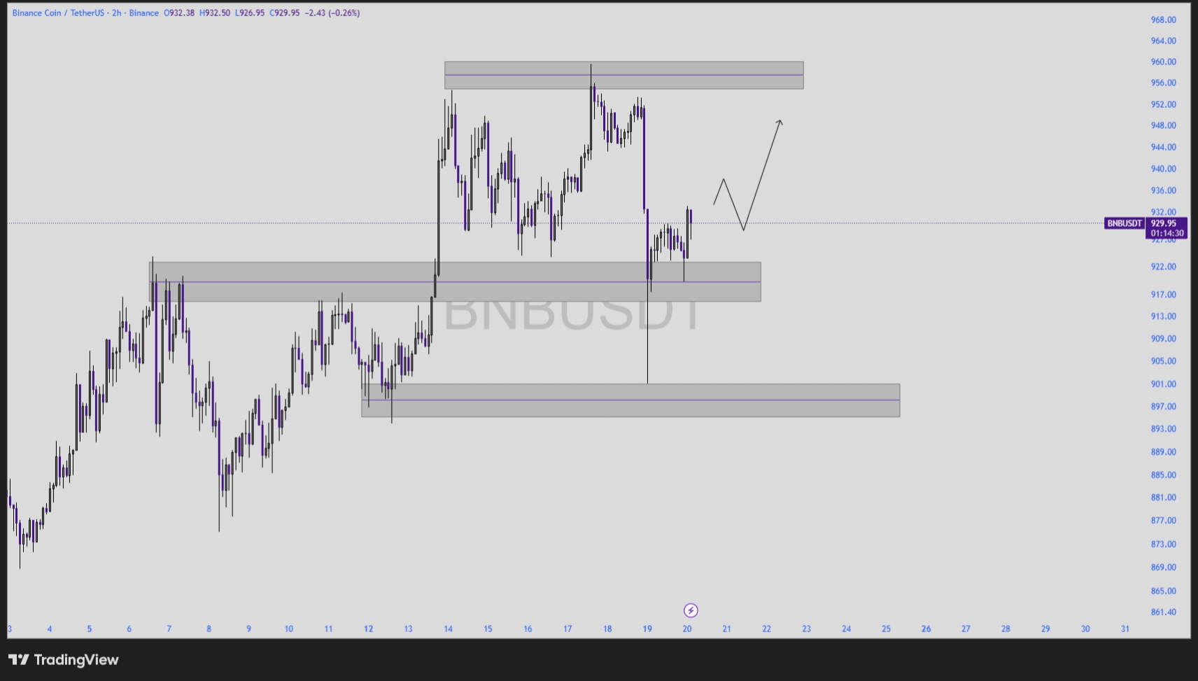 $BNB остается в устойчивой медвежьей фазе после того, как не смогла удержать недавние максимумы в районе $960–$968, с ясной последовательностью нижних максимумов и нижних минимумов, доминирующих в структуре на 2-часовом временном интервале. На более высоком временном интервале цена продолжает опускаться через несколько неудачных ралли и теперь тестирует крупную горизонтальную зону спроса в районе $920–$930, область, которая ранее действовала как структурный пол во время предыдущих коррекций.