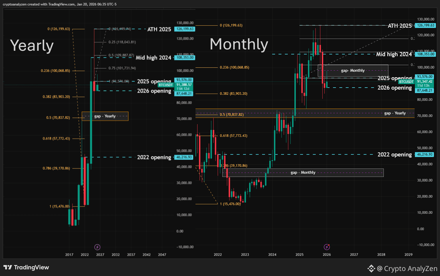 On the monthly chart, there is a gap between the October 2025 low (102,000.00) and the December 2025 high (94,588.99).