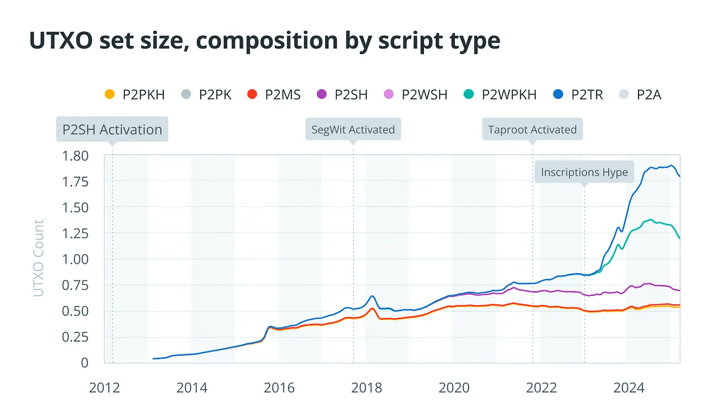 P2TR распространен по количеству, около 32.5% UTXO, но мал по стоимости в том же снимке, около 0.74% или 146,715 BTC. Его обнажение связано с дизайном ключевого пути Taproot, где измененный открытый ключ виден в блокчейне.