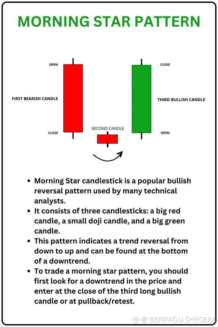 A 3-candle pattern in a downtrend: 1) A big red candle, 2) A small candle (doji or spinning top) that gaps down, 3) A big green candle that gaps up and closes into the first candle's body.