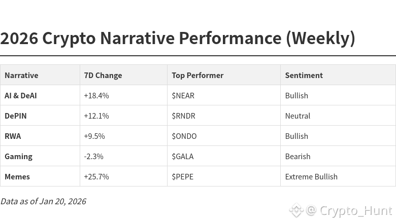 I've analyzed the top narratives for this week, and the data is clear: Memes and Al are leading the charge, while Gaming is taking a breather.