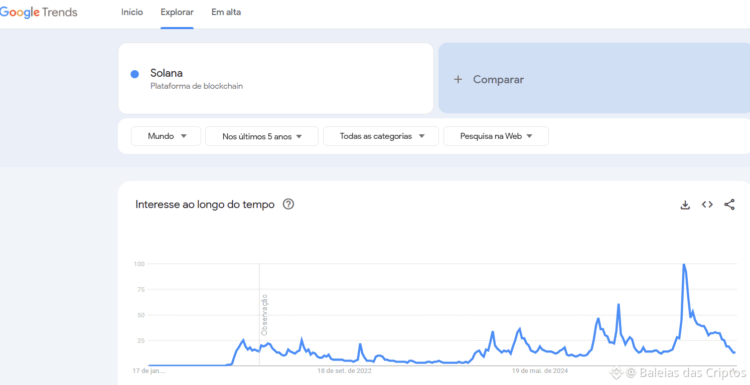 O Google Trends mostra algo clássico: o interesse por “Solana” ainda está longe do pico histórico. Isso é crucial. Sendo que a cada ciclo de alta o interesse fica cada vez maior! Quão grande será o interesse mundial por $SOL no próximo rali de alta?
