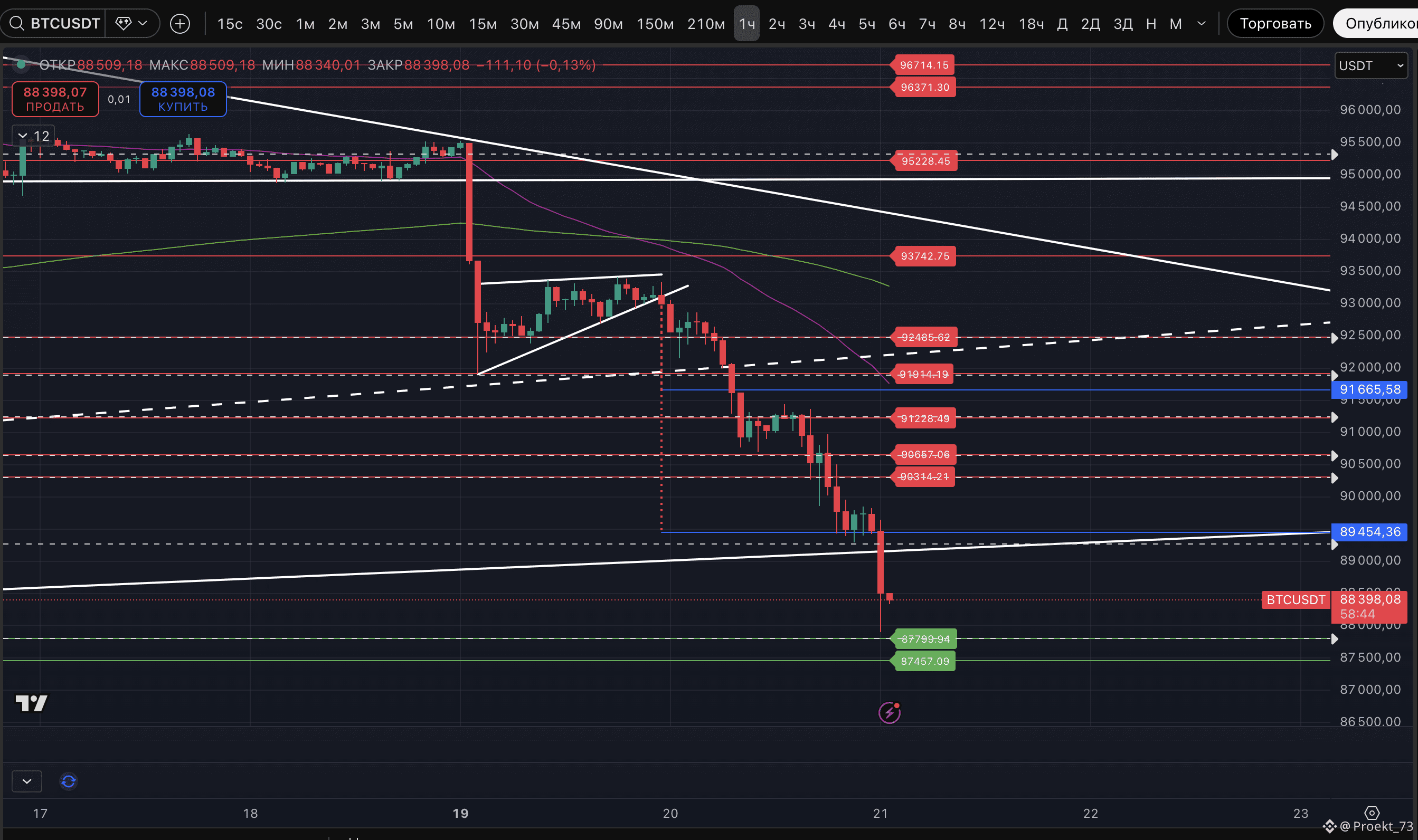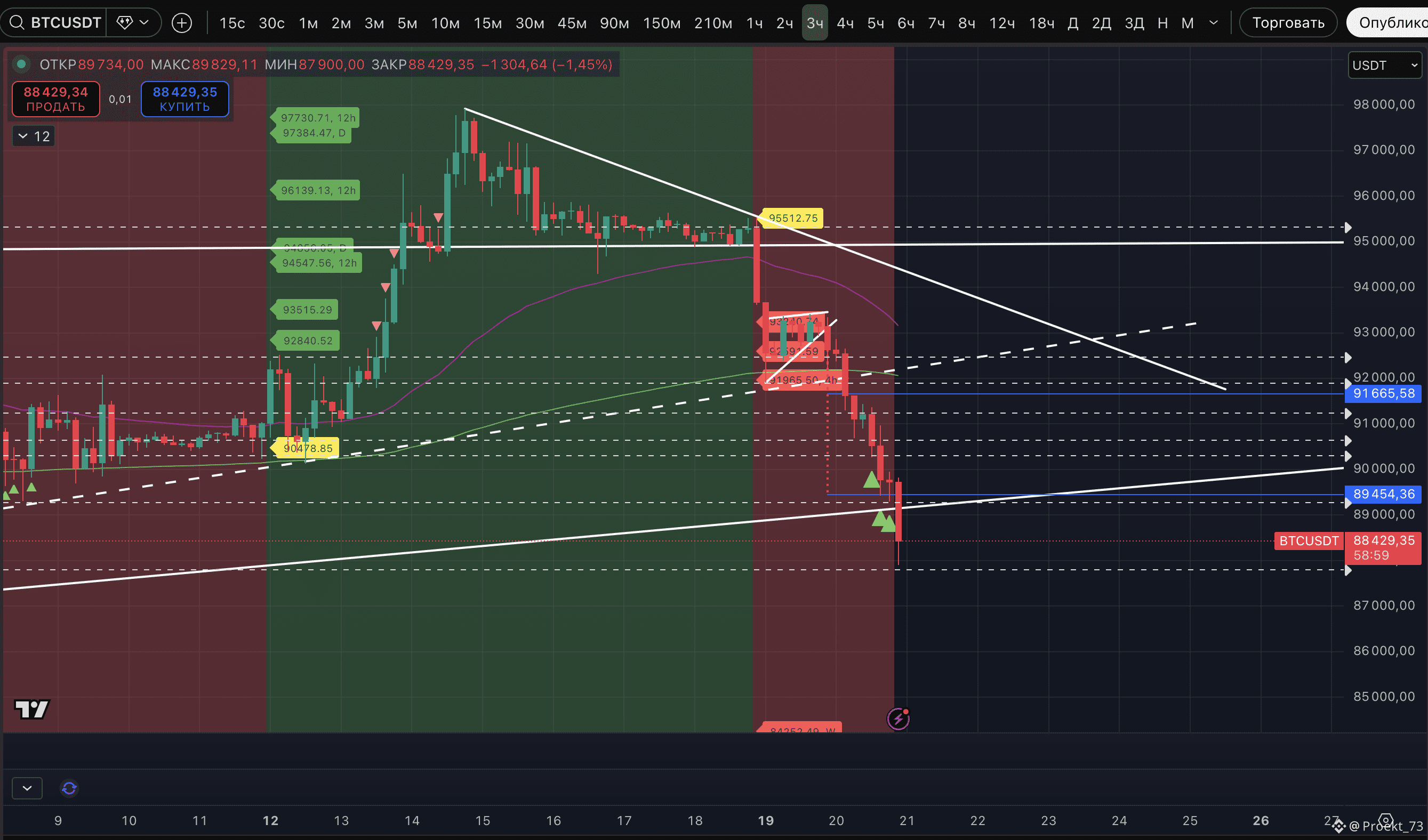 "Смелый" лонг-сетап по BTC себя не оправдал - лой 89 298$ обновлен. Причем самым коварным образом - одной минутной свечой.