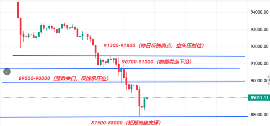 На четырехчасовом уровне RSI перепродан, поворачивается, наблюдается дивергенция цен, существует потребность в техническом восстановлении, но MACD все еще находится в состоянии роста медвежьих объемов. Сопротивление сверху последовательно на уровне 90000 долларов, 91435 долларов (вчерашний уровень отскока) и 94000 долларов. Пока цена не сможет эффективно восстановить 94000 долларов, все восстановления будут считаться слабыми отскоками, не следует слепо открывать длинные позиции.