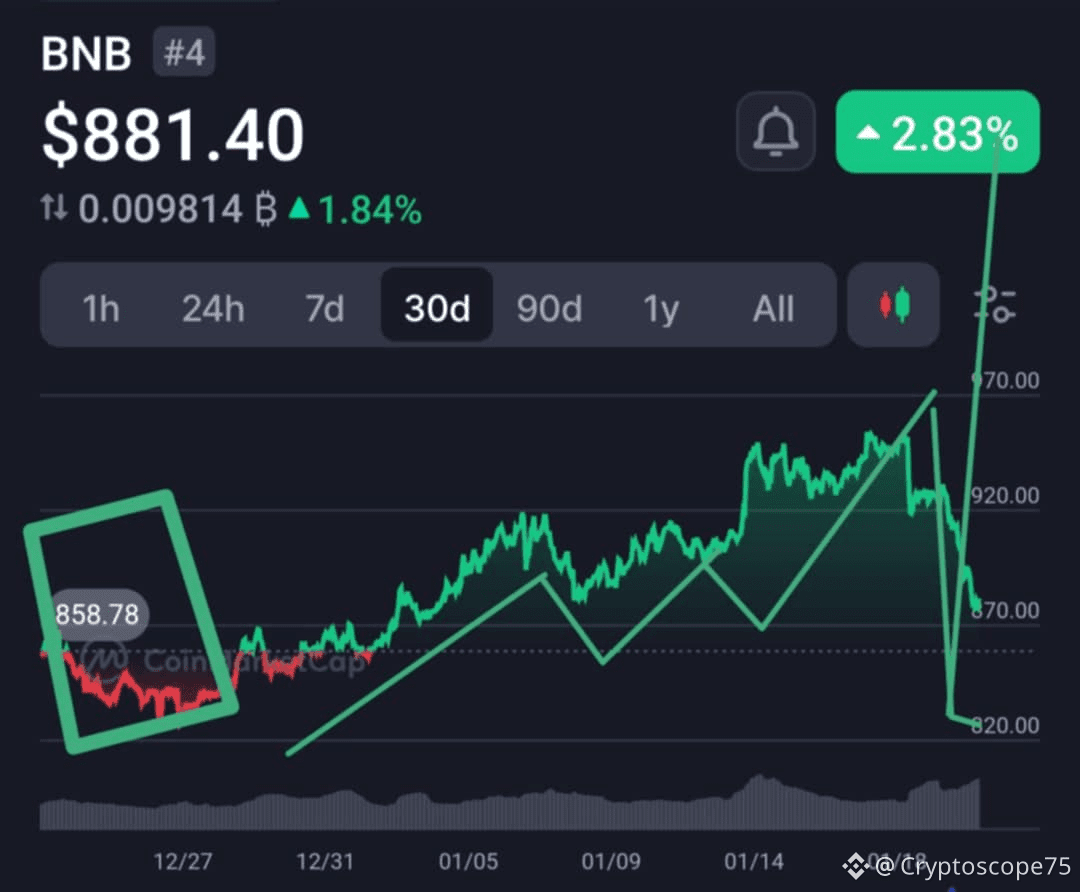 BNB first spent time consolidating in the $850–$860 region, forming a clear accumulation range. This base provided the foundation for a steady, staircase-style advance, where each impulse leg was followed by brief, controlled pullbacks.