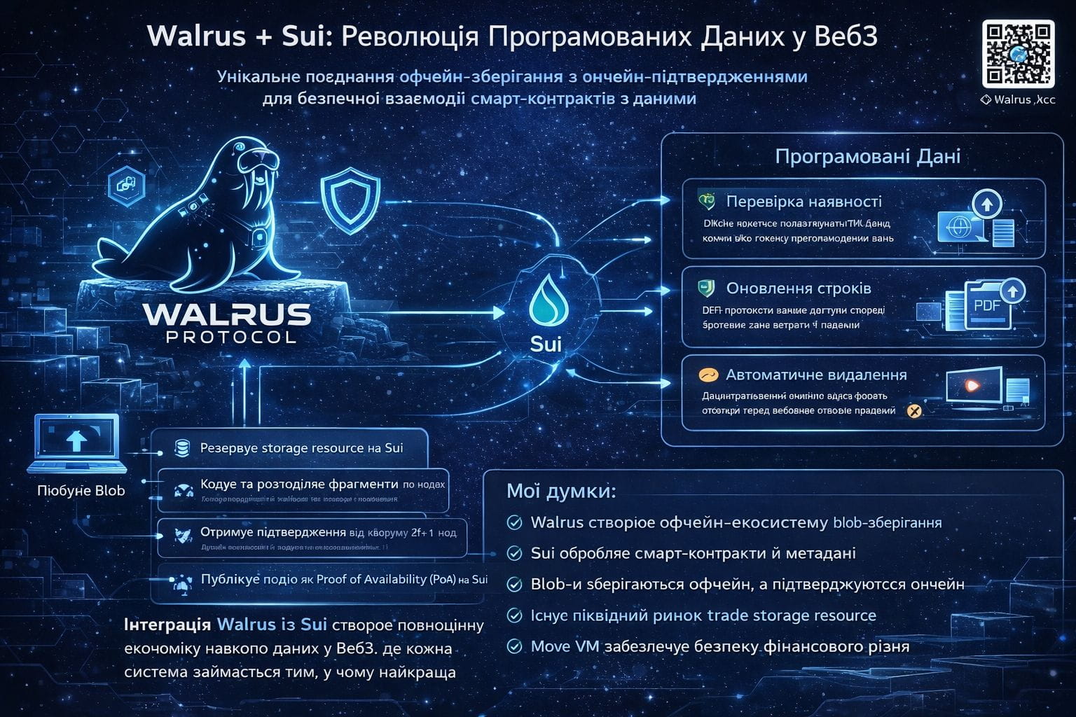 Когда я впервые услышала о том, что @Walrus 🦭/acc хранит Proof of Availability (PoA) на блокчейне Sui, моя первая реакция была: зачем усложнять, разве недостаточно просто иметь данные на узлах? Но потом я поняла, что именно это сочетание офчейн-хранения с ончейн-подтверждениями и создает революционное свойство, которое команда называет "программируемыми данными". Это не просто техническая деталь, это фундаментальное изменение того, как могут работать децентрализованные приложения. Традиционно децентрализованное хранение работает независимо от блокчейна: вы загружаете файл, получаете хеш или идентификатор, и все. Блокчейн может хранить этот хеш для верификации, но нет программируемой логики вокруг самих данных. $WAL делает другое: каждый blob, загруженный в Walrus, представлен как объект на блокчейне Sui с полным набором метаданных — blob ID, размер, период доступности, флажок возможности удаления. Это означает, что смарт-контракты могут непосредственно взаимодействовать с данными, проверять их наличие, продлевать срок хранения, даже удалять и освобождать пространство. Представьте NFT-маркетплейс, где смарт-контракт может автоматически проверить, что изображение для токена действительно доступно на Walrus и гарантированно останется таким минимум до конца года. Или DeFi-протокол, который принимает PDF-контракты в качестве залога, проверяя их наличие ончейн перед выполнением займа. Или децентрализованный YouTube, где видео автоматически удаляются после окончания оплаченного периода хранения, освобождая ресурсы для нового контента. Все это становится возможным, потому что данные больше не "где-то там в сети", они являются объектами первого класса в смарт-контрактах. Как это работает технически? Когда клиент загружает blob в #Walrus , он одновременно резервирует storage resource на Sui — объект, который представляет пространство и время хранения. Этот ресурс можно владеть, передавать, объединять с другими, как любой актив на блокчейне. Затем клиент кодирует данные через RedStuff, распределяет фрагменты по узлам и собирает подтверждения от кворума 2f+1 узлов. Эти подтверждения агрегируются в сертификат доступности, который публикуется как событие на Sui. С этого момента любой может проверить, что blob доступен, просто проверив ончейн-событие. Нет необходимости доверять отдельным узлам или делать сложные запросы — блокчейн служит источником истины. Что делает это особенно мощным? Sui использует Move VM — язык программирования, разработанный Meta специально для безопасной работы с цифровыми активами. В отличие от Solidity в Ethereum, где легко создать уязвимости, Move делает невозможными целые классы ошибок благодаря своей типовой системе и концепции владения ресурсами. Это означает, что данные на Walrus могут быть программированы с таким же уровнем безопасности, как финансовые активы. И есть еще одна деталь: storage resources на Sui можно разделять и объединять. Если вы купили пространство на 100 ГБ на год, но использовали лишь 60 ГБ, можете продать остаток другому пользователю. Или наоборот, если вам нужно больше пространства, можете купить неиспользуемый ресурс на вторичном рынке. Это создает ликвидный рынок хранения, где цены определяются спросом и предложением, а не фиксированными тарифами. Walrus становится не просто хранилищем, а полноценной экономической экосистемой вокруг данных. И когда смотришь на проект