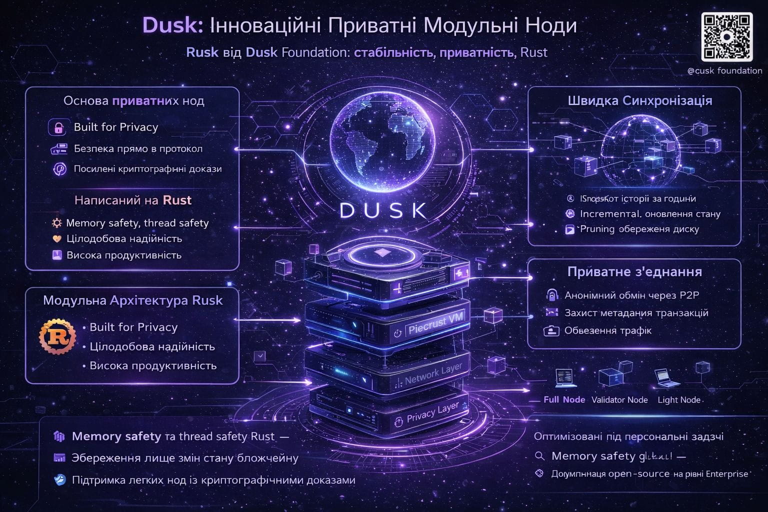 Когда изучала архитектуру большинства блокчейнов, заметила интересную вещь: приватность обычно добавляется как слой поверх базового протокола, как после мысли, а не как фундаментальная часть дизайна системы. @Dusk с Rusk, ихней реализацией узла, доказали, что можно сделать иначе, строя узлы, где приватность — это базовая функциональность, а не дополнительная опция. Rusk написан на Rust, языке, который гарантирует безопасность памяти и безопасность потоков на уровне компилятора, что критически важно для софта, который управляет финансовыми активами и должен работать 24/7 без сбоев. Технически Rusk состоит из нескольких компонентов: слой консенсуса, который управляет алгоритмом Sukuk, слой выполнения с Piecrust VM, сетевой слой для P2P коммуникации и слой приватности с протоколом Citadel, и все эти слои тесно интегрированы друг с другом. $DUSK сделал Rusk модульным: вы можете запустить полный узел, который хранит всю историю блокчейна, легкий узел для мобильных устройств или валидатор узла для участия в консенсусе, и каждый тип узла оптимизирован под конкретные нужды. Что меня поразило, так это эффективность синхронизации: новые узлы могут синхронизироваться с сетью за часы, а не дни, благодаря механизмам снимков и оптимизированной структуре данных, которая минимизирует количество операций чтения с диска. #Dusk внедрил инкрементные обновления состояния, где узлы хранят только изменения состояния вместо полного состояния на каждый блок, и это радикально уменьшает требования к дисковому пространству без ущерба для безопасности или верификации. Сетевой протокол оптимизирован для приватности: даже метаданные о транзакциях обфусцированы, чтобы внешние наблюдатели не могли определить, кто с кем взаимодействует, анализируя трафик сети. Rusk поддерживает обрезку исторических данных для узлов, которые не хотят хранить весь блокчейн, но при этом могут верифицировать новое состояние через криптографические доказательства, и это делает участие в сети доступным даже для устройств с ограниченными ресурсами. Техническая документация Rusk настолько подробная и качественная, что любой опытный разработчик может поднять свой узел за час, и это контрастирует со многими проектами, где документация устарела или неполная. Мои эксперименты с запуском узла Rusk показали стабильность и надежность на уровне программного обеспечения производственного класса, что редкость в криптоиндустрии, где многие проекты все еще находятся на бета-стадии даже спустя годы после запуска. Я глубоко убеждена, что качество реализации узла часто важнее, чем протокол сам по себе, потому что даже лучший протокол бесполезен, если софт, который его реализует, полон багов или неудобен в использовании, и Dusk это понимает лучше, чем большинство конкурентов.