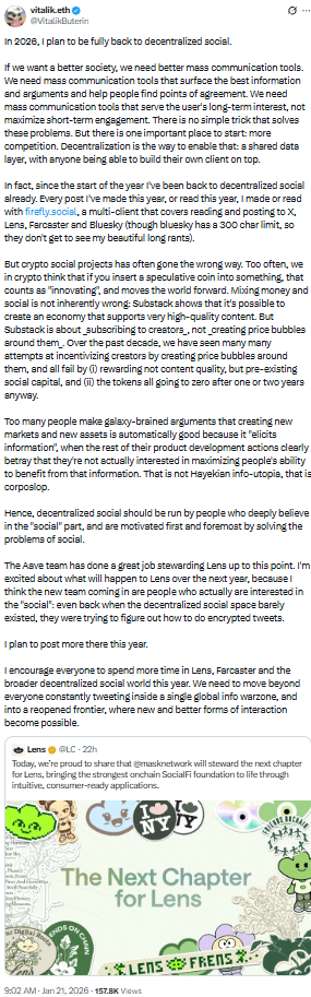 Бутерин также объявил о планах значительно увеличить свою активность на Lens в этом году и призвал сообщество проводить больше времени на Lens, Farcaster и в более широком децентрализованном социальном экосистеме.