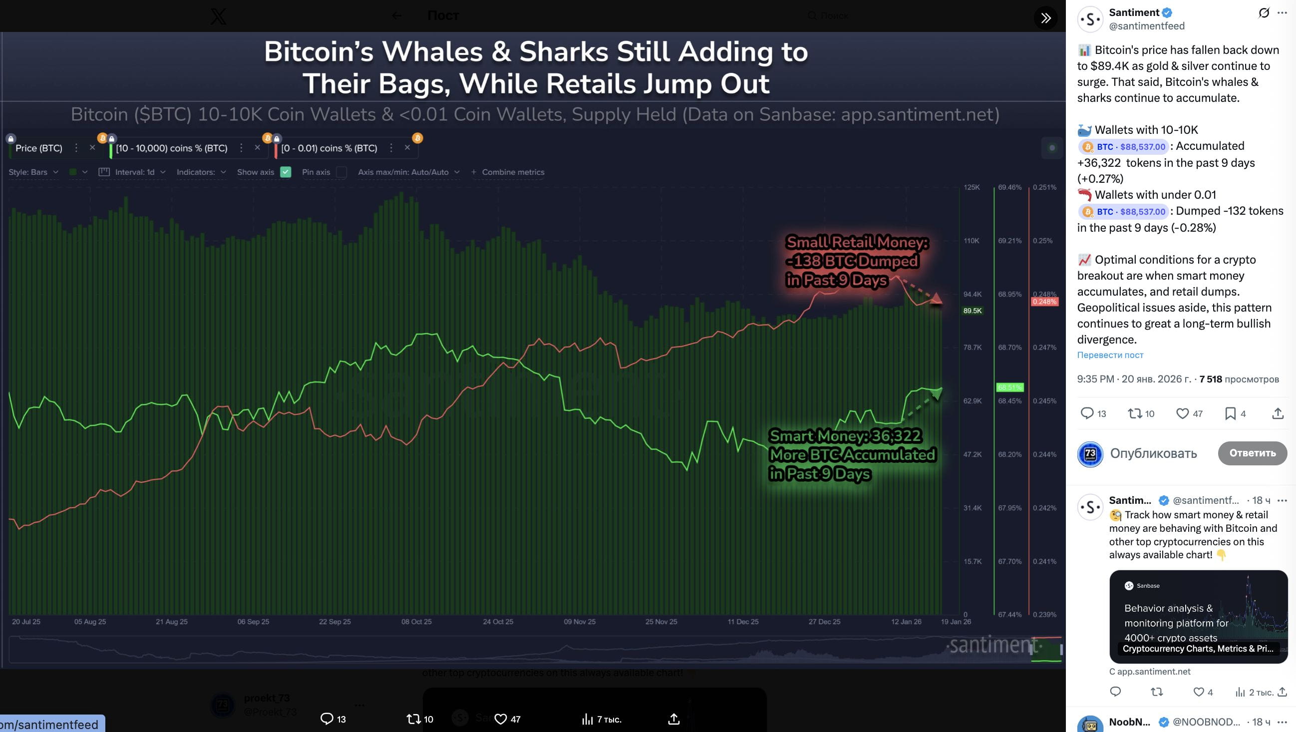 Santiment: крупные кошельки докупают BTC, розница выходит из позиций.