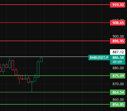 如果夜间上不去887这个位置,那这波1-2小时级别反弹没有力度,再次回踩下方支撑位留意875-864-856这几个位置附近!#BNB走势