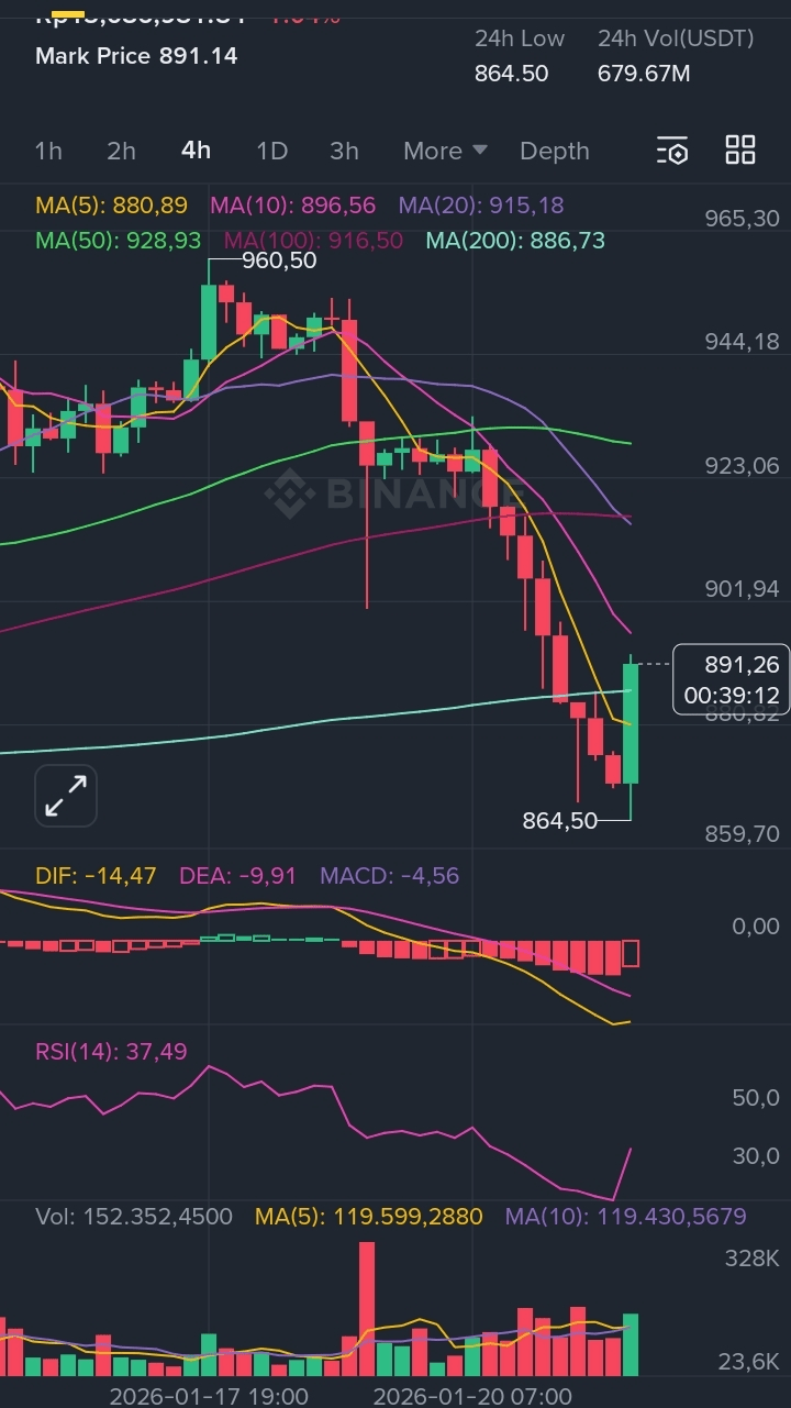 Ценовое действие & Поддержка: BNB нашел локальное дно на $864.50. В данный момент мы наблюдаем сильную попытку "бычьего поглощения" на текущей 4-часовой свече, возвращая цену к $891.57. Это показывает, что покупатели входят на психологическом уровне $860.