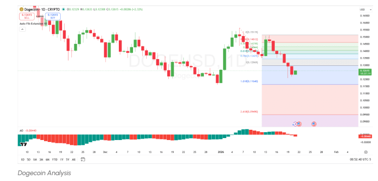 Недавние ценовые действия Dogecoin предполагают некоторое покупательское давление после достижения ключевых уровней Фибоначчи. Суточный график показывает, что Dogecoin недавно тестировал, но упал ниже уровня 1 на $0.1297. Тем не менее, движясь к уровню 1.681 на $0.116, цена нашла поддержку на $0.120 и теперь нацелена на повторный тест $0.129.