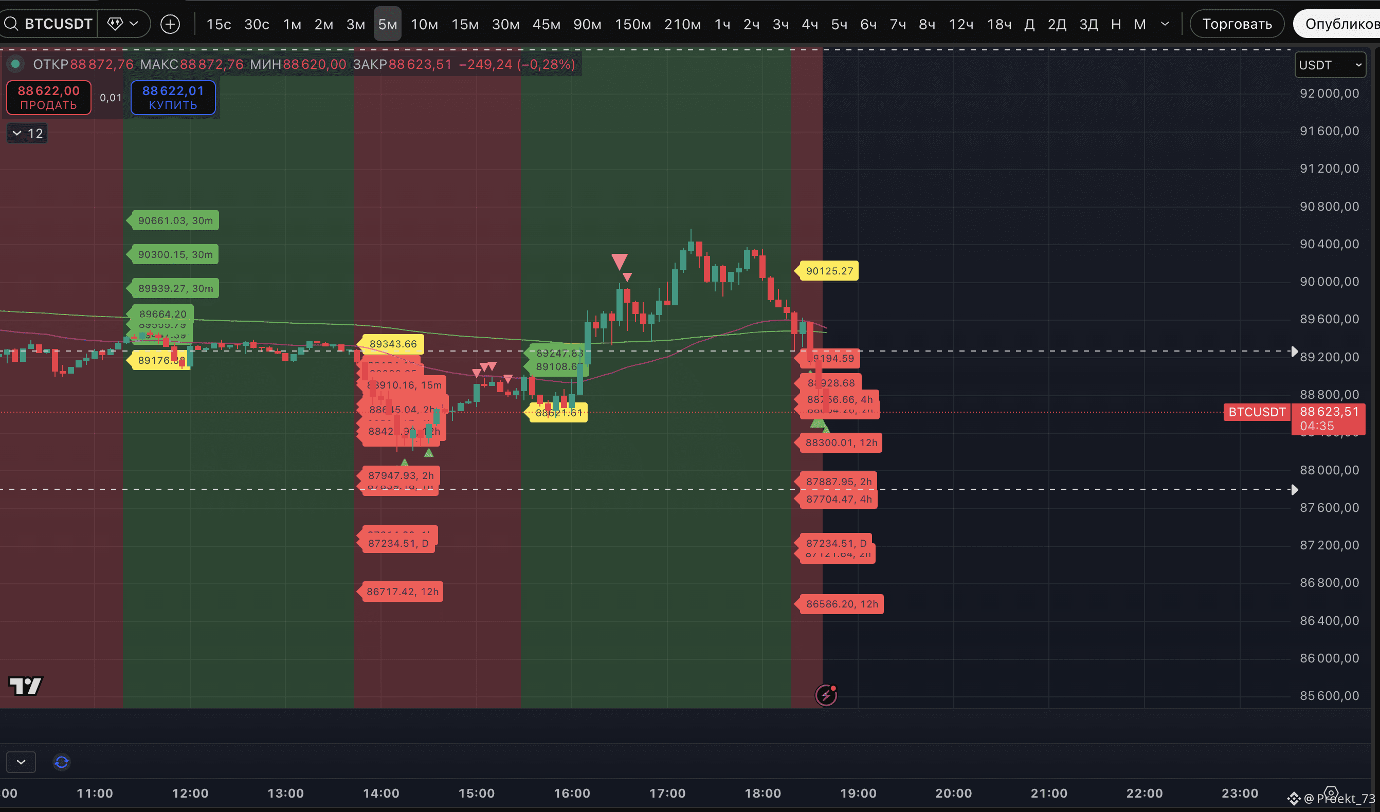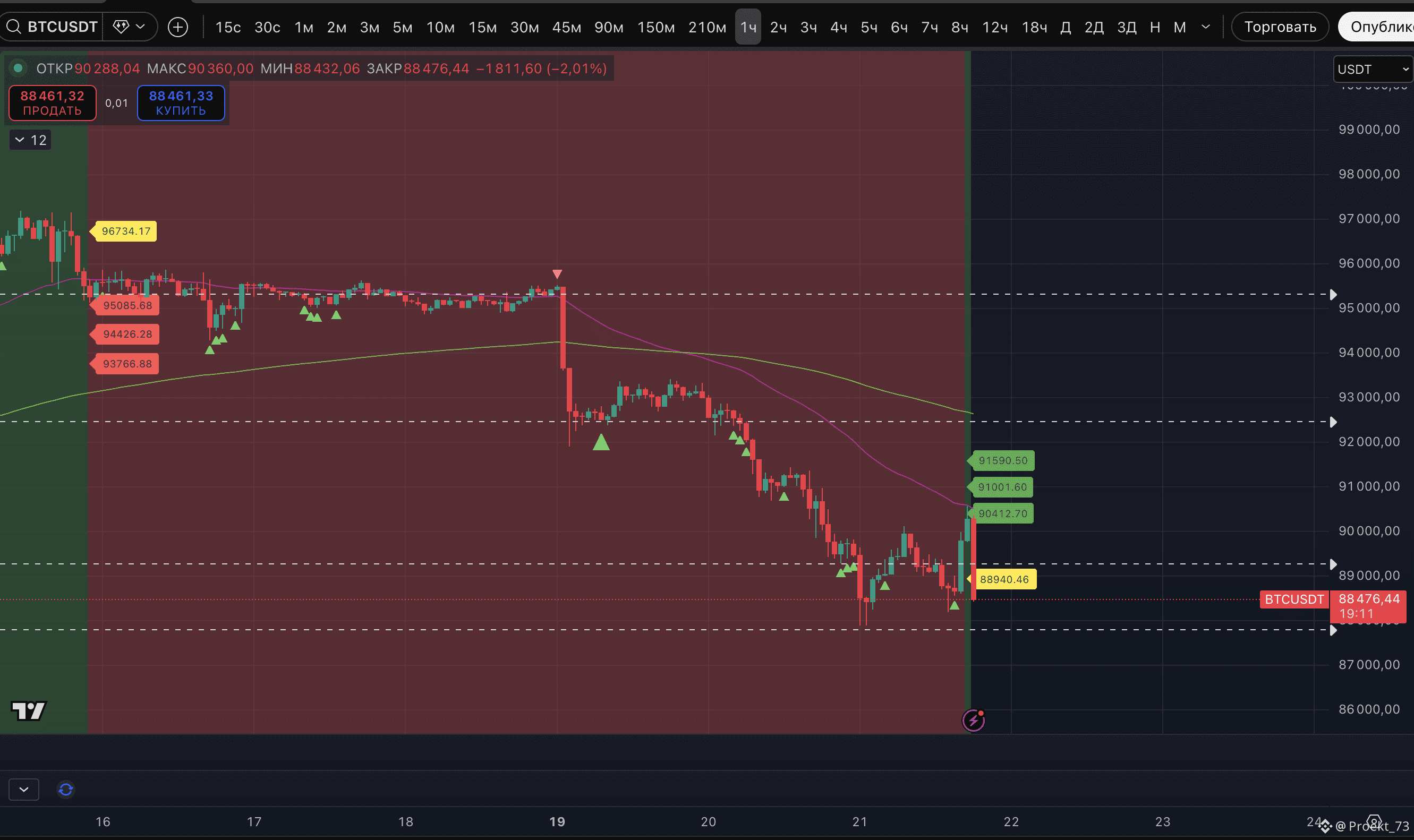 Пока, как видно, рост на выступлении Трампа в Давосе поглощен и график больше склоняется ко второму варианту. У BTC, вслед за XRP и SOL, сейчас есть устойчивый аптренд на часовом ТФ по нашему индикатору. Но пока что он с серьезными угрозами слома. Если часовая свеча закроется ниже 88 740$ и пойдет закрепление под уровнем - весь рост на выступлении Трампа можно будет оценивать как локальный отскок дохлой кошки, шорт-сквиз.
