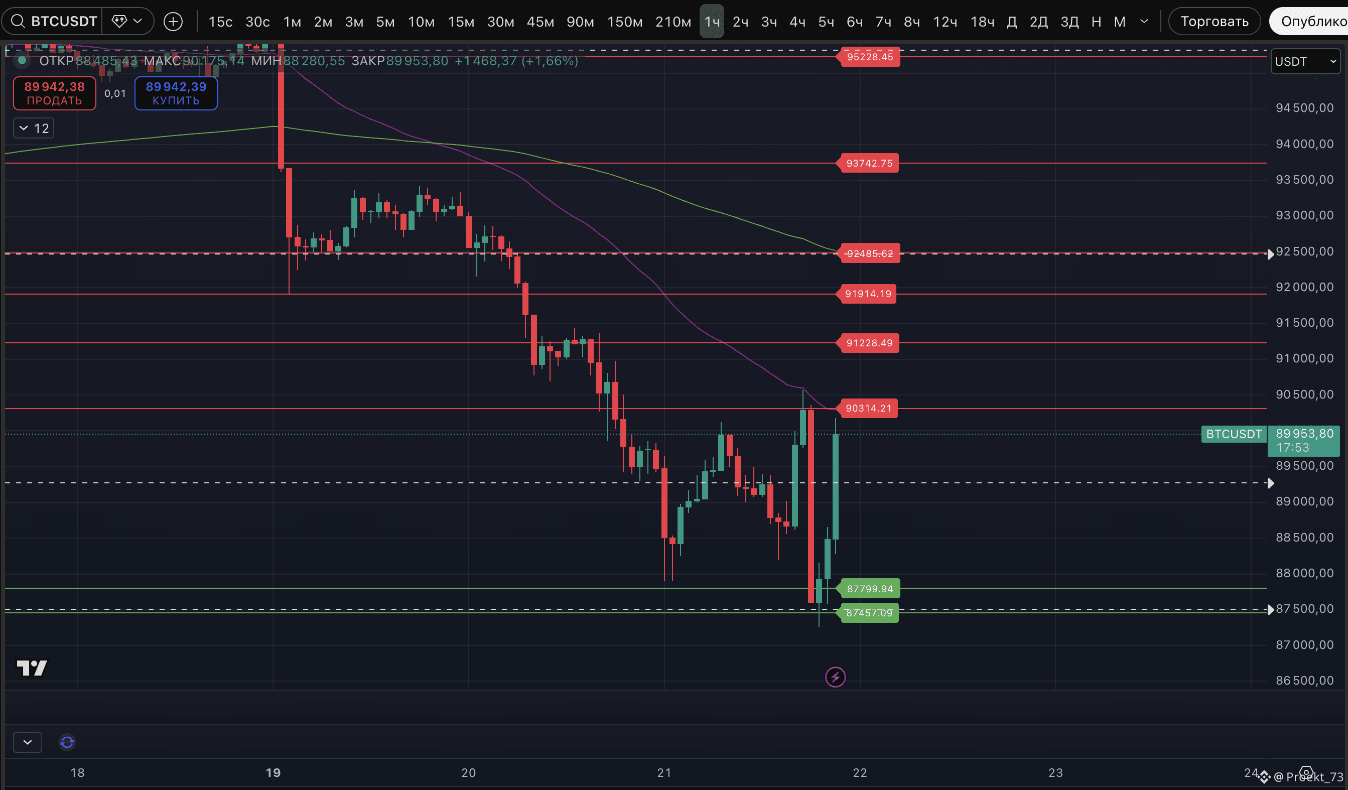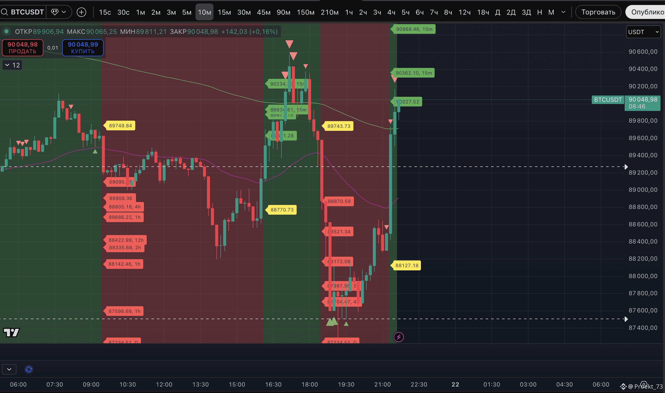 BTC на этой новости снова пошел выше 90 000$. Но снова показывает Strong signal потенциального хая на 10-минутном ТФ. Если посмотреть этот ТФ - актив только и делает, что ходит между Strong signal потенциального хая и лоя на 10-минутном ТФ последние 4 часа. Напрашивается вывод, что теперь снова вниз и "распил" продолжается. Как уже писали, пока цена не начнет закрепляться выше 90 314$ - она смотрит вниз.
