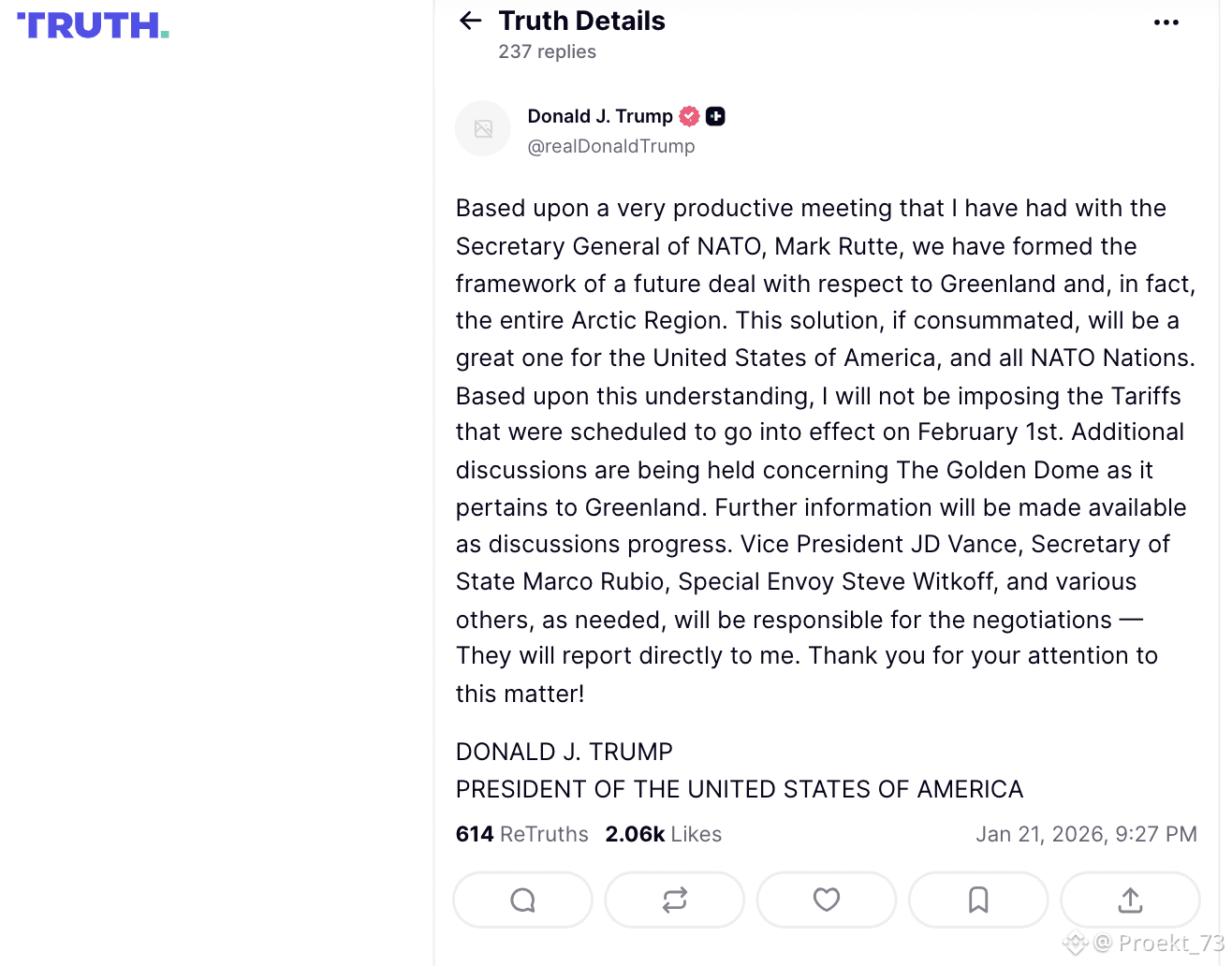 "Основываясь на очень продуктивной встрече, которую я провел с Генеральным секретарем НАТО Марком Рютте, мы сформировали основу будущего соглашения в отношении Гренландии и, фактически, всего Арктического региона. Это решение, если оно будет реализовано, станет отличным для Соединенных Штатов Америки и всех стран НАТО.