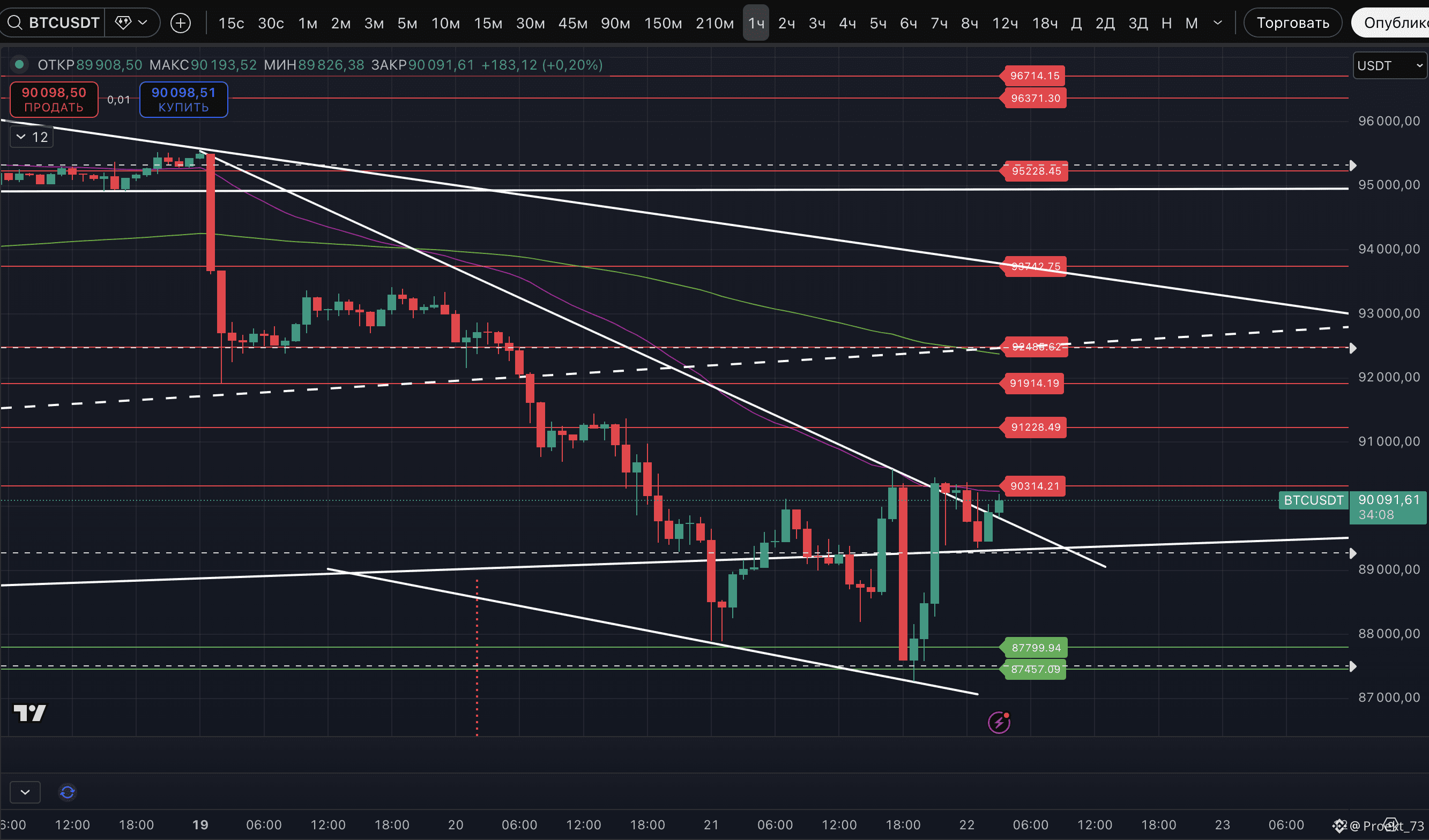 - EMA 50 часового ТФ (на сейчас в районе 90 241$),