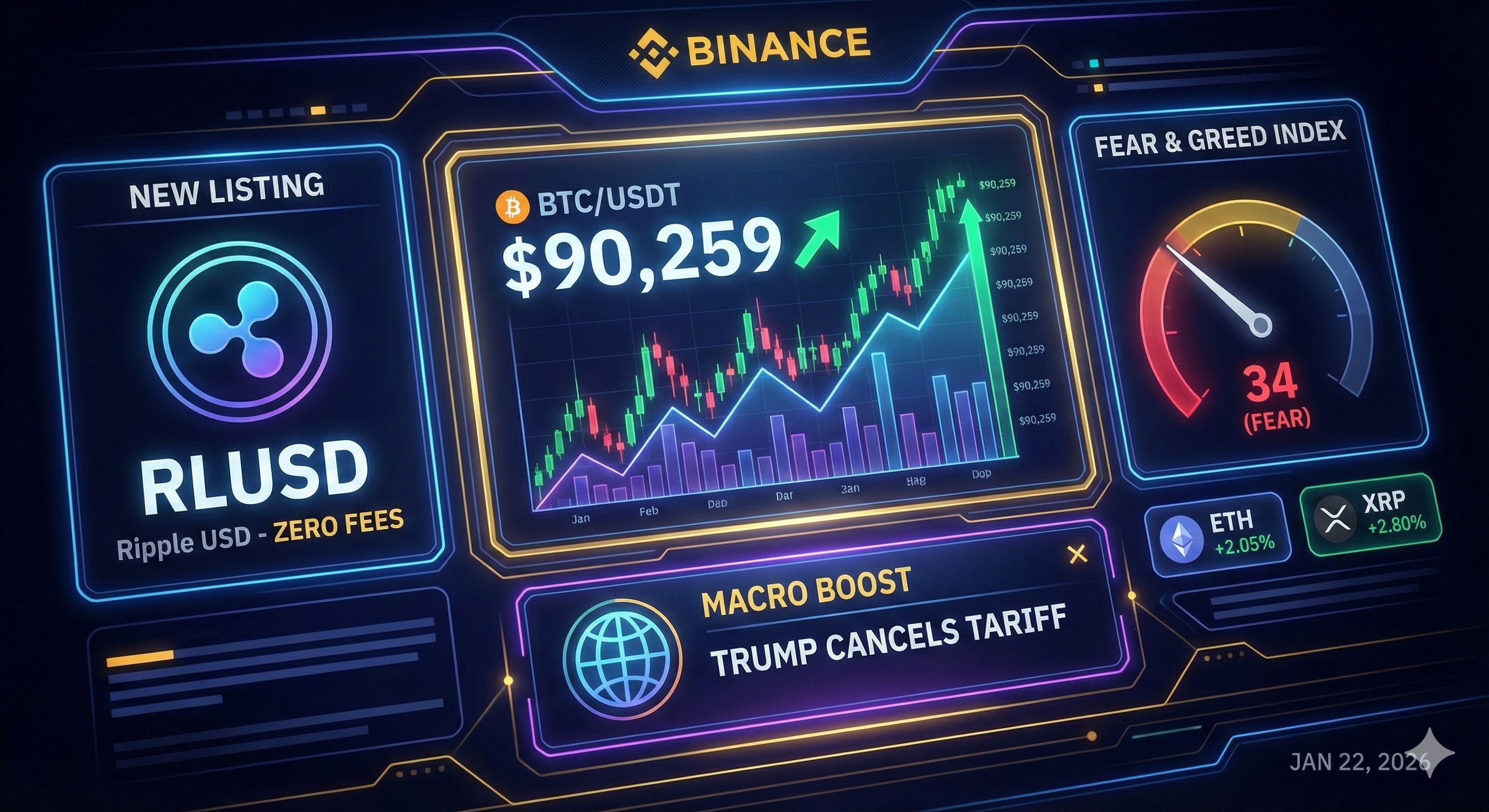 Macro Boost: Global markets breathed a sigh of relief as President Trump canceled the proposed Greenland tariff. The news immediately boosted U.S. stock indices and correlated crypto assets, helping Bitcoin reclaim critical support levels.