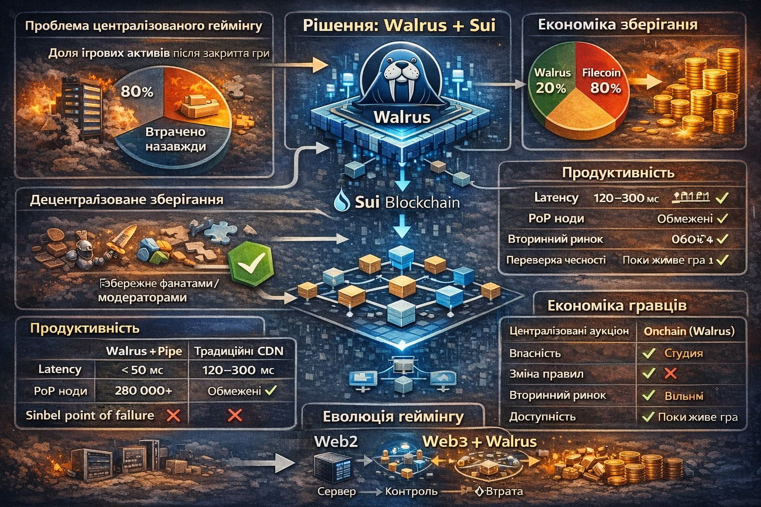 Что делает Walrus идеальным для игр? Во-первых, программируемость: игровые активы существуют как объекты на Sui, и смарт-контракты могут с ними взаимодействовать, изменять свойства, даже эволюционировать в зависимости от событий. Представьте меч, который становится сильнее после каждой победы, и эта история хранится ончейн, проверена и неизменна. Во-вторых, стоимость: загрузка текстур, моделей, аудио на Walrus стоит на 80% дешевле, чем на Filecoin, что делает его экономически жизнеспособным даже для инди-студий с ограниченными бюджетами. В-третьих, скорость: интеграция с Pipe Network через 280 тысяч Point of Presence узлов обеспечивает задержку менее 50 миллисекунд, что критически важно для динамичных игр, где задержки означают поражение. Геймеры в Аргентине и Японии получают контент одинаково быстро, как будто играют на одном сервере. И вот что меня больше всего впечатляет: Walrus не просто предлагает технологию, он меняет экономику гейминга. Разработчики могут токенизировать игровые активы как NFT, хранить их на Walrus с гарантиями пожизненной доступности и создавать вторичные рынки, где игроки продают, покупают, обменивают предметы без посредников. Это уже не централизованный аукцион от студии, где правила меняются по желанию, а децентрализованный маркетплейс, управляемый смарт-контрактами. TradePort, крупнейший NFT-маркетплейс на Sui, уже использует Walrus для хранения метаданных всех игровых предметов в экосистеме, и объемы торговли растут экспоненциально. Но наибольший потенциал Walrus в будущем AAA-тайтлов: когда большие студии поймут, что могут снять нагрузку с собственных серверов, экономить миллионы на инфраструктуре и при этом дать игрокам истинное владение, индустрия изменится навсегда. Мы уже видим первые сигналы: Mysten Labs, команда за Walrus, активно работает с гейминговыми студиями, чтобы интегрировать протокол в новые проекты. И когда смотришь на $140 миллионов фандрайзинга от a16z, Standard Crypto и Electric Capital — фондов, которые инвестировали в самые успешные гейминговые проекты Web3 — понимаешь, что это не эксперимент, а стратегическая ставка на будущее индустрии, которая генерирует $200 миллиардов доходов каждый год.
