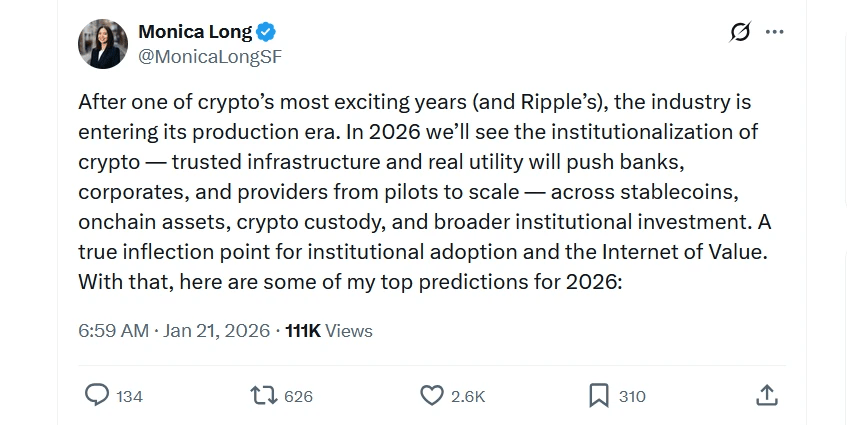 Президент Ripple Моника Лонг говорит, что принятие крипто сдвигается от хайпа к реальной бизнес-инфраструктуре.